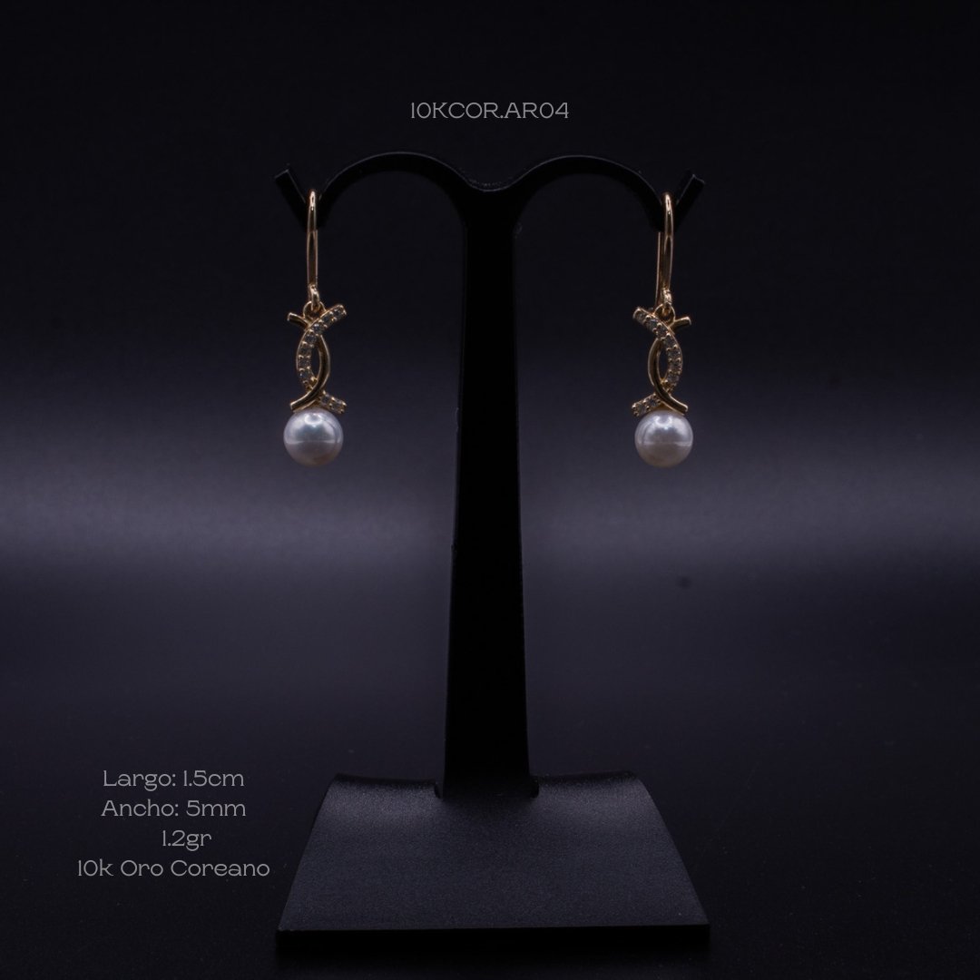 Arete largo de 10k Coreano en oro amarillo con diseño entrelazado; una línea lisa y una con incrustación de zirconia mini, con una perla al final. Medidas: 1.5cm de largo y 5mm de ancho. Gramaje: 1.2gr. Precio sujeto a las cotizaciones diarias del oro.