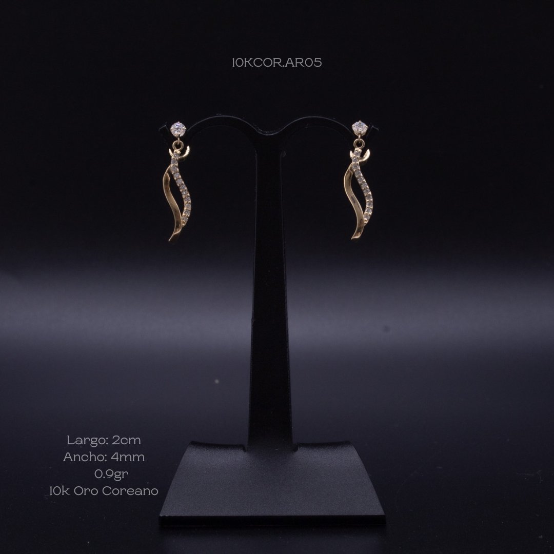 Arete largo de 10k Coreano en oro amarillo con diseño de incrustación de zirconia mini, y dos ondas colgantes unidas; una lisa y una con incrustación de zirconia, con cierre de tuerca. Medidas: 2cm de largo y 4mm de ancho. Gramaje: 0.9gr. Precio sujeto a las cotizaciones diarias del oro.