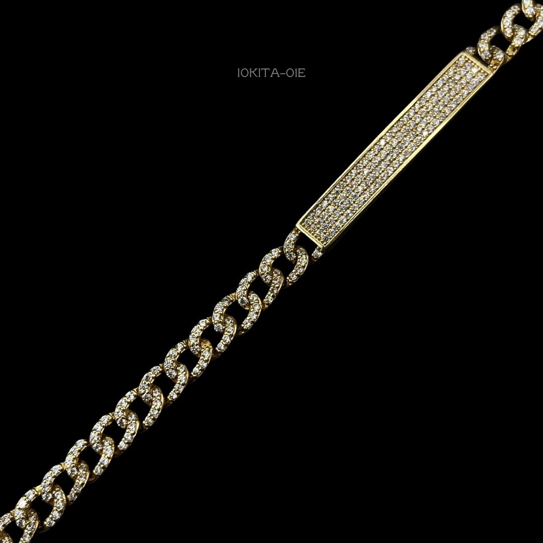 Esclava de 10k Italiano de tejido barbado cubierta con incrustación de zirconia. Medidas: 21cm de largo, 5mm de ancho en placa y 5mm de ancho en cadena. Gramaje: 10.8gr. Precio sujeto a las cotizaciones diarias del oro.