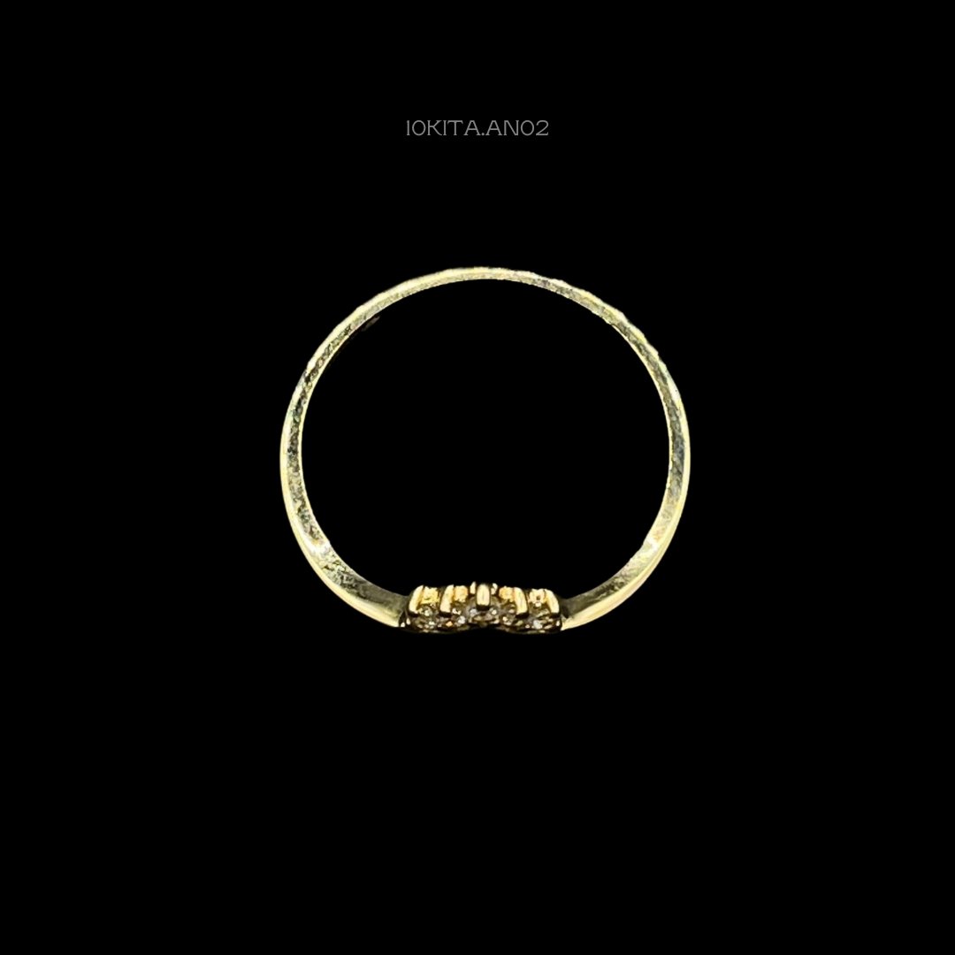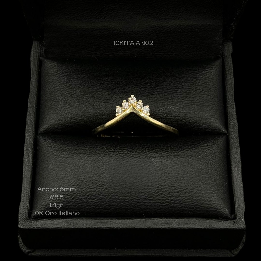 Anillo de 10k Italiano en oro amarillo con diseño de vertice y 5 zirconias incrustadas. Medidas: 6mm de ancho en #8 1/2. Gramaje: 1.4gr. Precio sujeto a las cotizaciones diarias del oro.