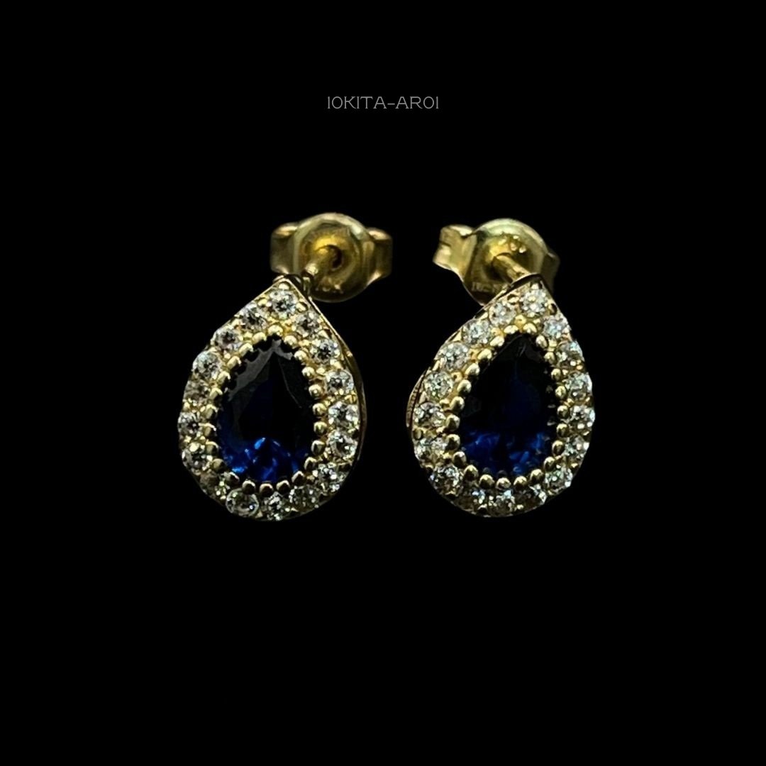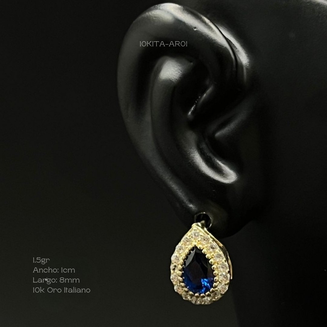 Aretes de 10k Italiano en oro amarillo con diseño de gota con incrustación de zirconia azul rey y zirconia mini alrededor. Medidas: 1cm de largo y 8mm de ancho. Gramaje: 1.5gr. Precio sujeto a las cotizaciones diarias del oro.