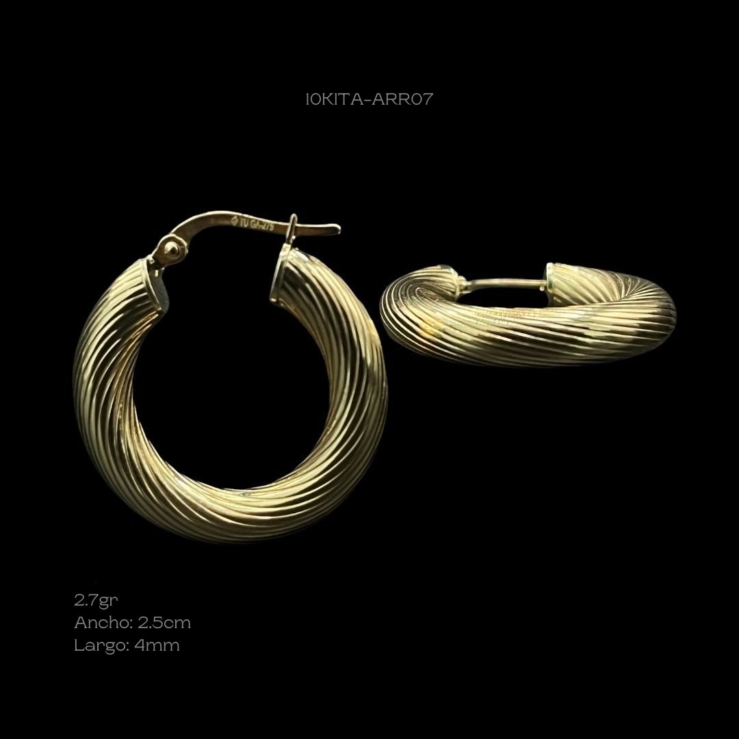 Arracadas de 10k Italiano con diseño de textura torzal. Medidas: 2.5cm de largo y 4mm de ancho. Gramaje: 2.7gr. Precio sujeto a las cotizaciones diarias del oro.