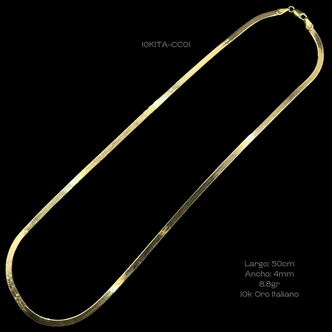 Cadena de 10k Italiano de tejido planchado. Medidas: 50cm de largo y 4mm de ancho. Gramaje: 8.8gr. Precio sujeto a las cotizaciones diarias del oro.
