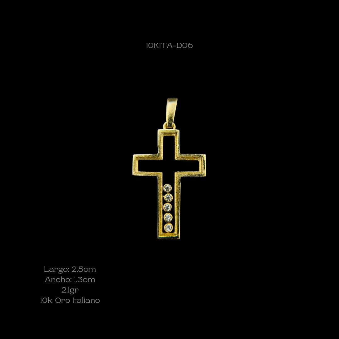 Dije de 10k Italiano con diseño de cruz con cinco zirconias encapsuladas. Medidas: 2.5cm de largo y 1.3cm de ancho. Gramaje: 2.1gr. Precio sujeto a las cotizaciones diarias del oro.