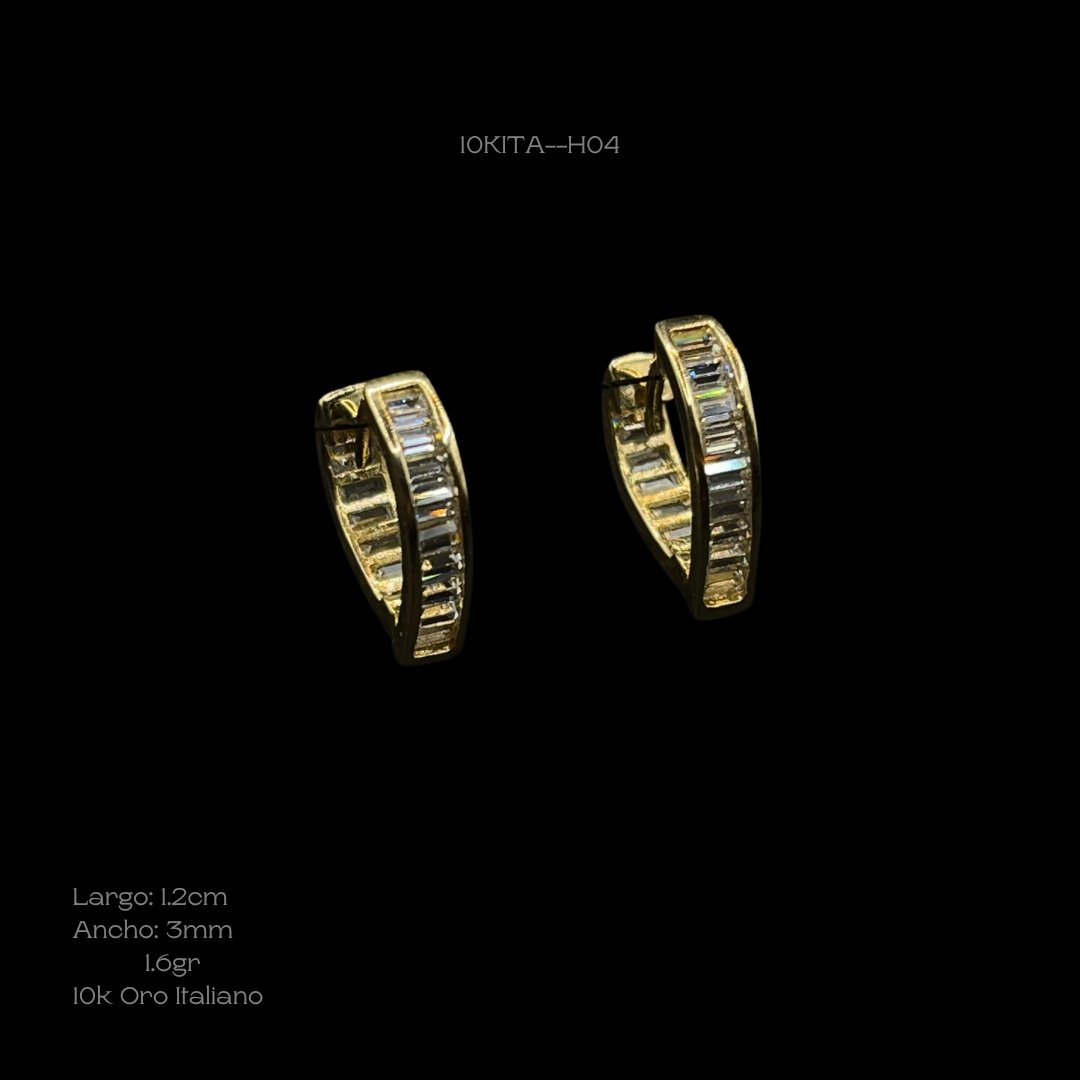 Hoops de 10k Italiano en oro amarillo con diseño de hilera de zirconias baguette. Medidas: 1.2cm de largo y 3mm de ancho. Gramaje: 1.6gr. Precio sujeto a las cotizaciones diarias del oro.