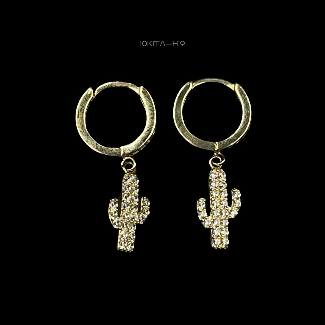 Hoops de 10k Italiano en oro amarillo con diseño de incrustación de zirconia con un colguije de cactus cubierto de zirconia. Medidas: 2.5cm de largo y 6mm de ancho. Gramaje: 1.8gr. Precio sujeto a las cotizaciones diarias del oro.