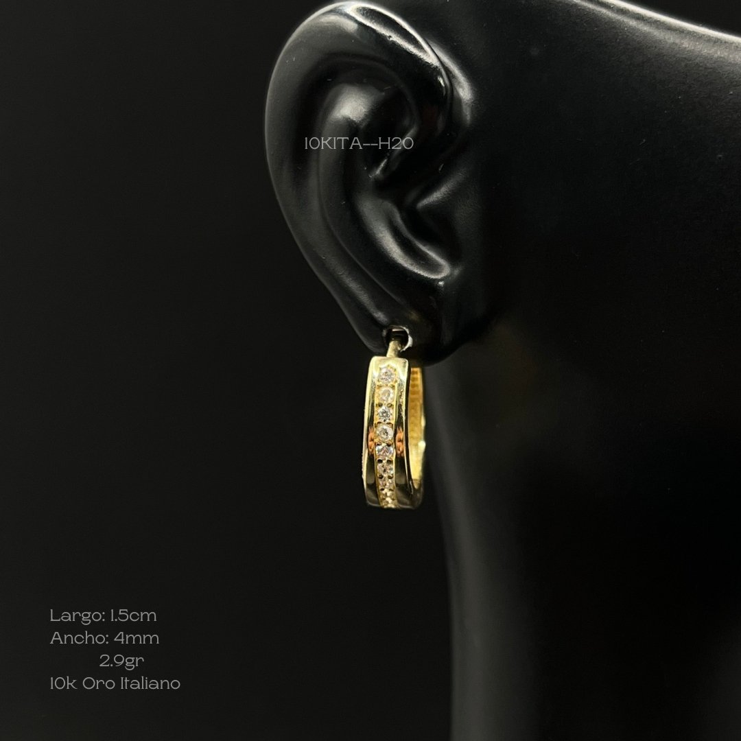 Hoops de 10k Italiano en oro amarillo con diseño de una hilera central de zirconia. Medidas: 1.5cm de largo y 4mm de ancho. Gramaje: 2.9gr. Precio sujeto a las cotizaciones diarias del oro.