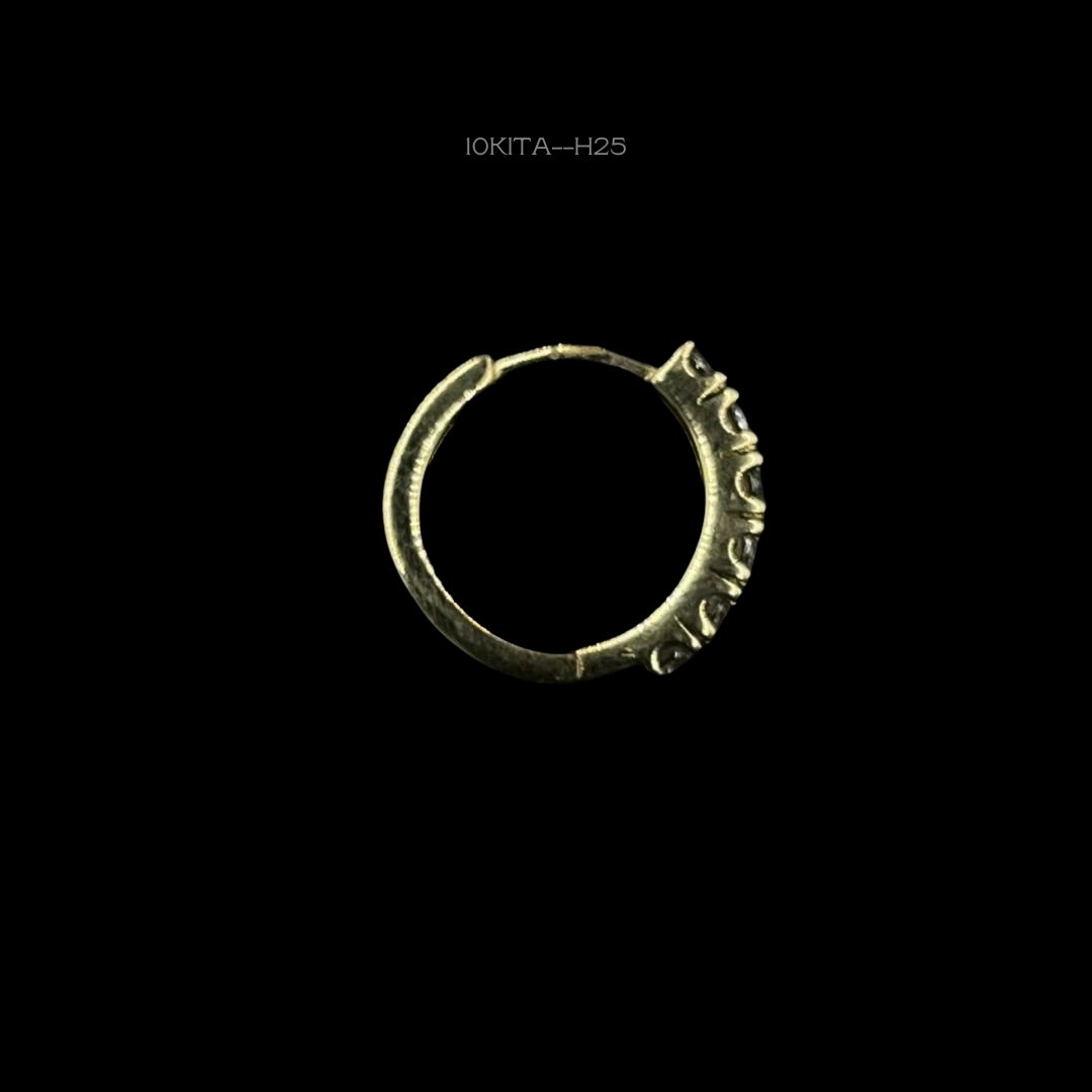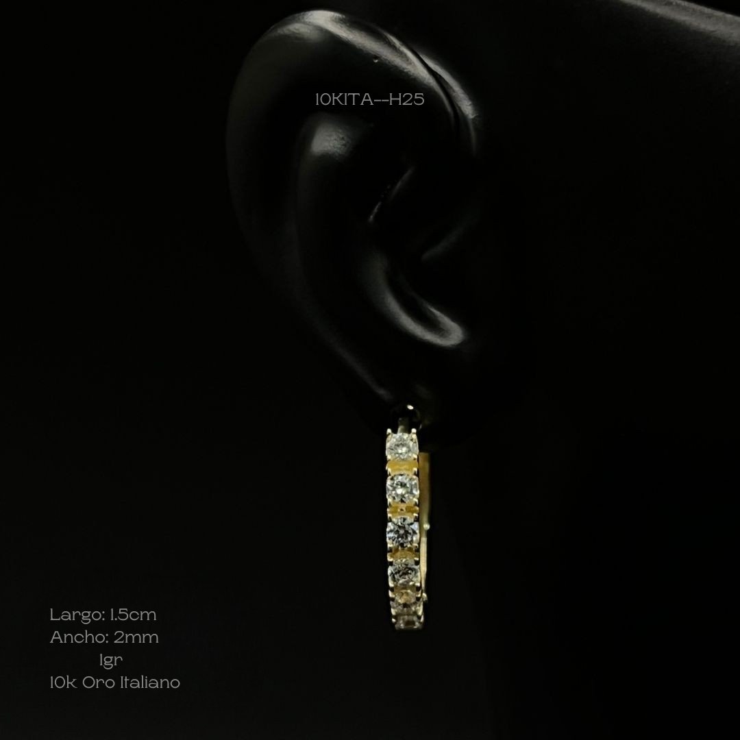 Hoops para perforación de 10k Italiano en oro amarillo con diseño de seis zirconias. Medidas: 1.5cm de largo y 2mm de ancho. Gramaje: 1gr. Precio sujeto a las cotizaciones diarias del oro.
