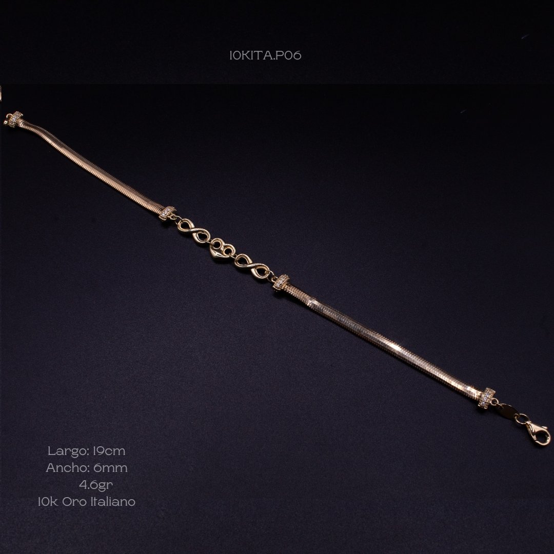 Pulsera de 10k Italiano con diseño de panza de víbora y diseño central de dos infinitos entrelazados con un corazón al centro, con separaciones con incrustación de zirconia mini. Medidas: 19cm de largo y 6mm de ancho. Gramaje: 4.6gr. Precio sujeto a las cotizaciones diarias del oro.