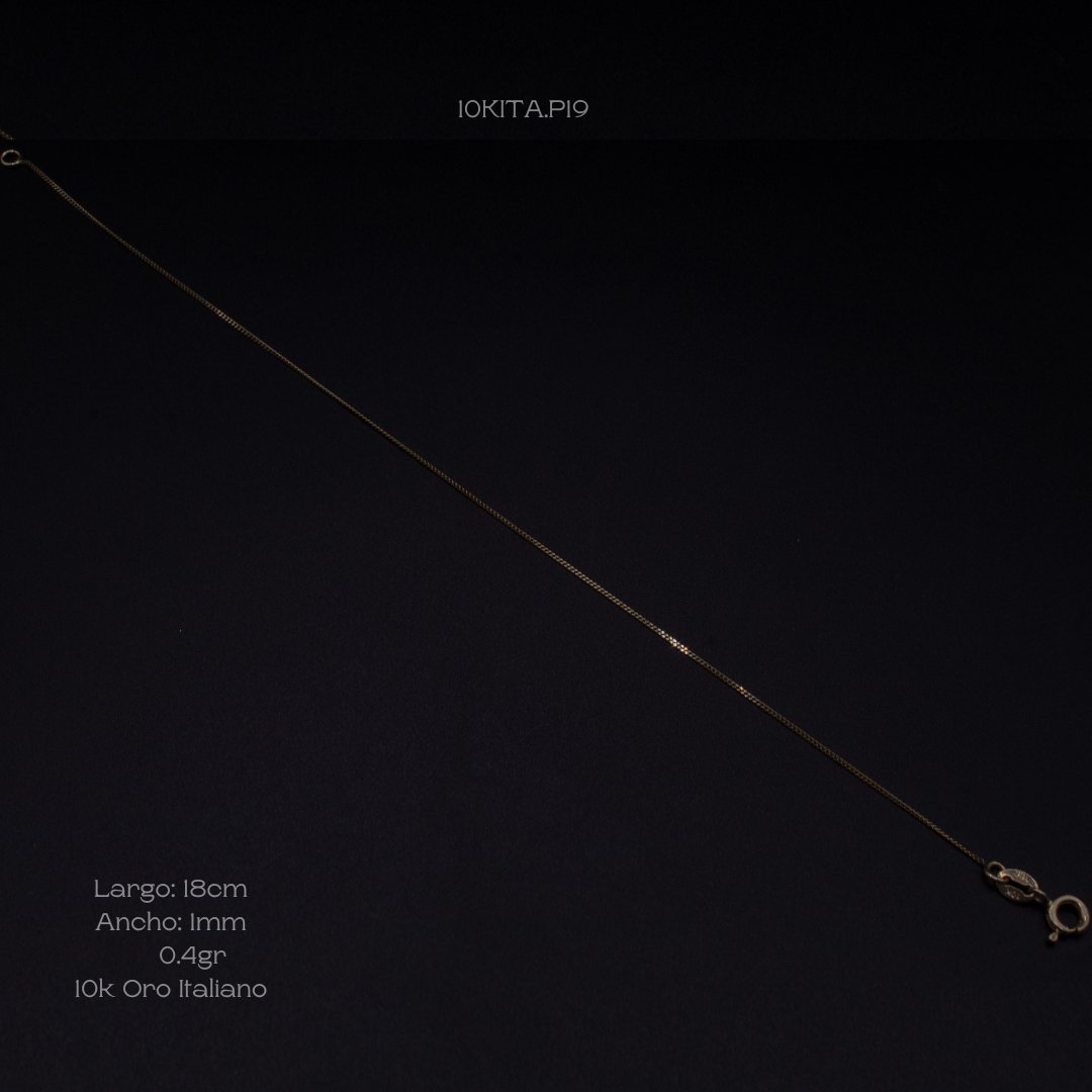 Pulsera de 10k Italiano con tejido de eslabones. Medidas: 18cm de largo y 1mm de ancho. Gramaje: 0.4gr. Precio sujeto a las cotizaciones diarias del oro.