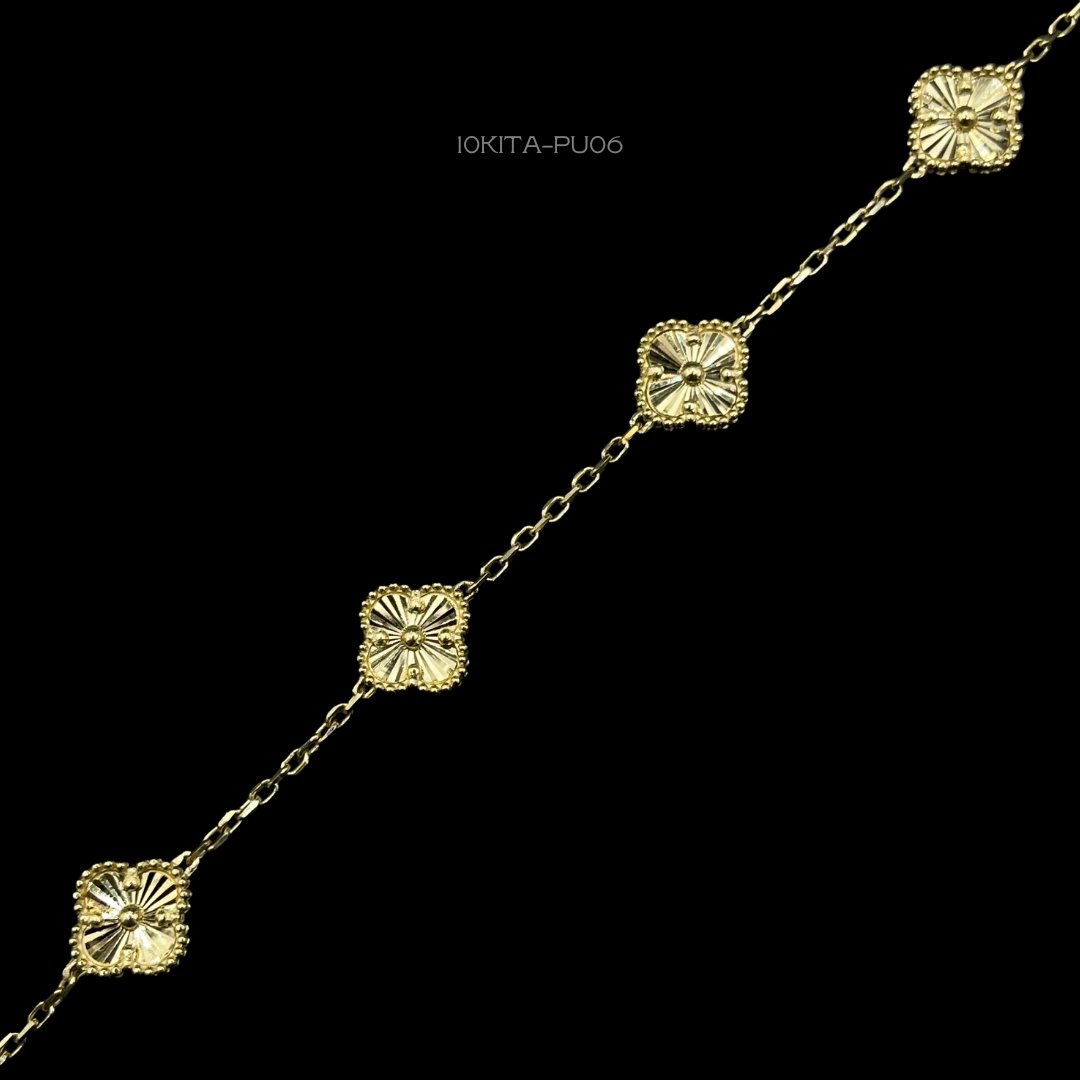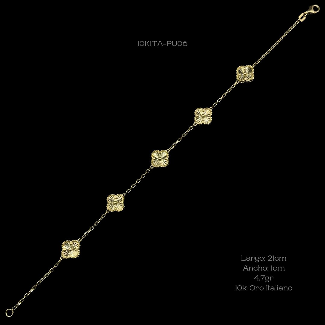 Pulso de 10k Italiano con diseño de cinco tréboles diamantados. Medidas: 21cm de largo y 1cm de ancho. Gramaje: 4.7gr. Precio sujeto a las cotizaciones diarias del oro.