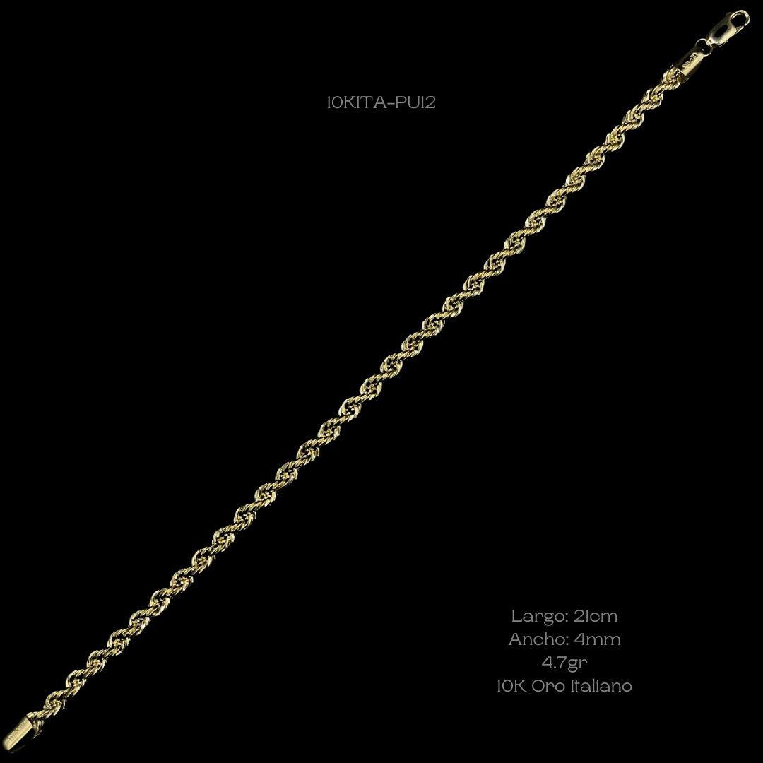 Pulso de 10k Italiano con tejido torzal. Medidas: 21cm de largo y 4mm de ancho. Gramaje: 4.7gr. Precio sujeto a las cotizaciones diarias del oro.