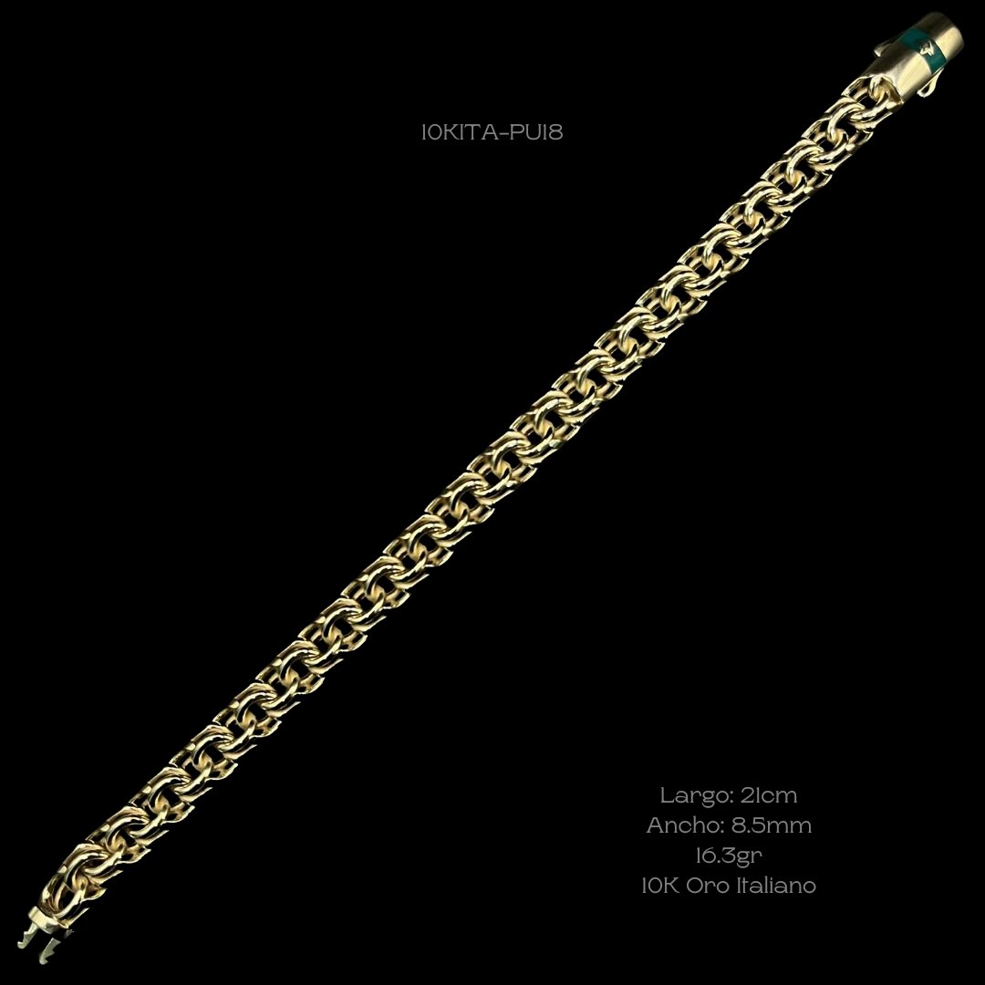 Pulso de 10k Italiano de tejido chino con cierre de caja. Medidas: 21cm de largo y 8.5mm de ancho. Gramaje: 16.3gr. Precio sujeto a las cotizaciones diarias del oro.