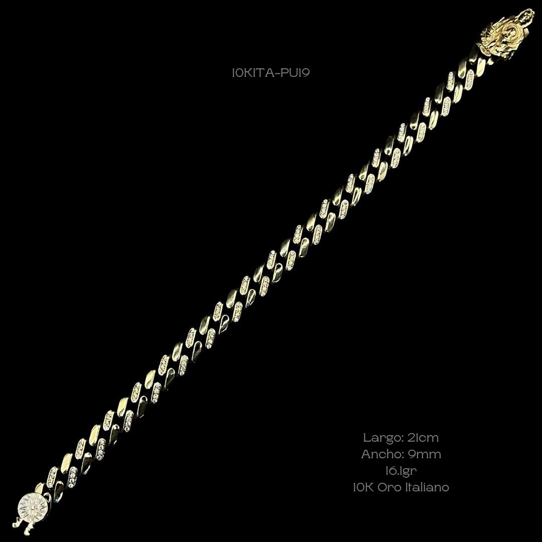 Pulso de 10k Italiano de tejido barbado con eslabones lisos y eslabones con zirconia, broche de caja con diseño de san Judas Tadeo en oro amarillo y un sol en oro blanco. Medidas: 21cm de largo y 9mm de ancho. Gramaje: 16.1gr. Precio sujeto a las cotizaciones diarias del oro.