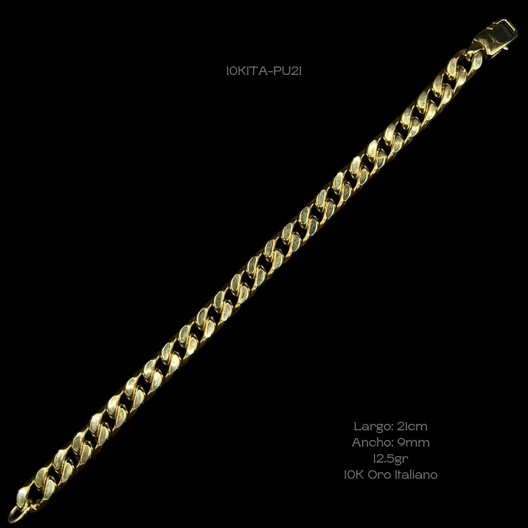 Pulso de 10k Italiano de tejido barbado. Medidas: 21cm de largo y 9mm de ancho. Gramaje: 12.5gr. Precio sujeto a las cotizaciones diarias del oro.