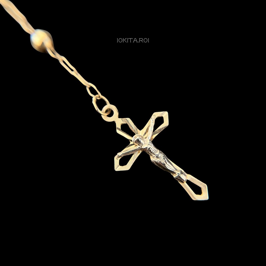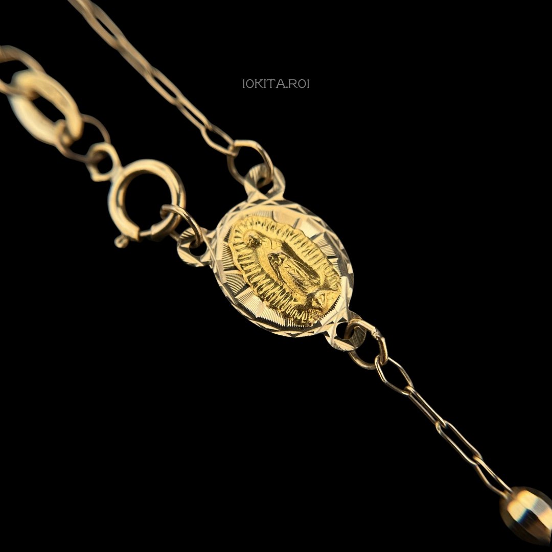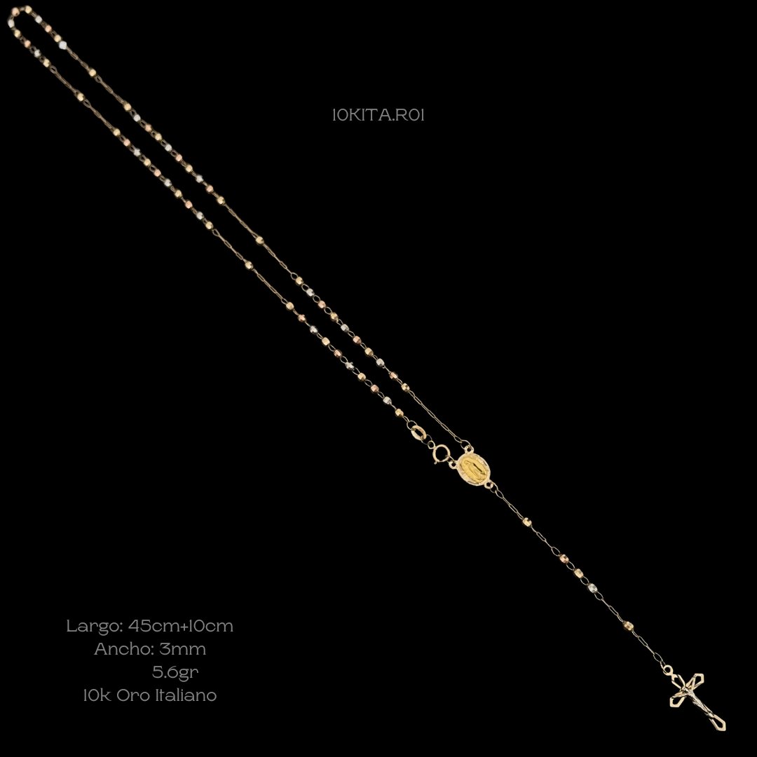 Rosario de 10k Italiano con diseño de rosario florentino de la Virgen de Guadalupe, con el Cristo del crucifijo en oro blanco. Medidas: 45cm de largo en el cuello y 10cm restantes; 3mm de ancho en la bola. Gramaje: 5.6gr. Precio sujeto a las cotizaciones diarias del oro.
