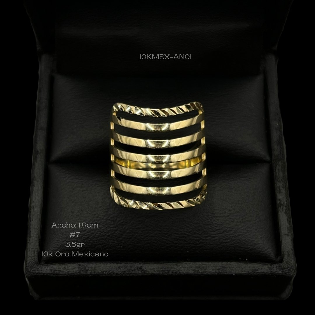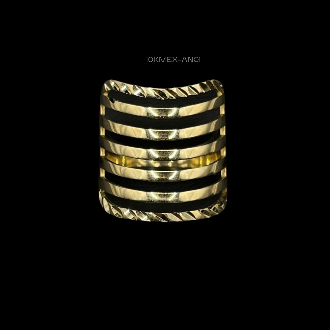 Anillo de 10k Mexicano en oro amarillo con diseño de semanario con la primera y ultima línea diamantada. Medidas: 1.9cm de ancho en #7. Gramaje: 3.5gr. Precio sujeto a las cotizaciones diarias del oro.