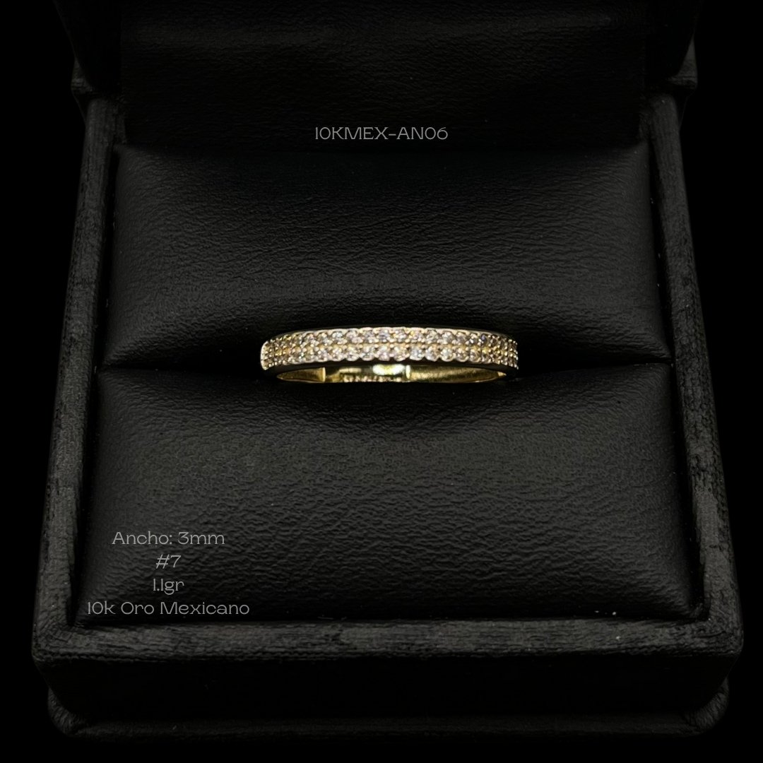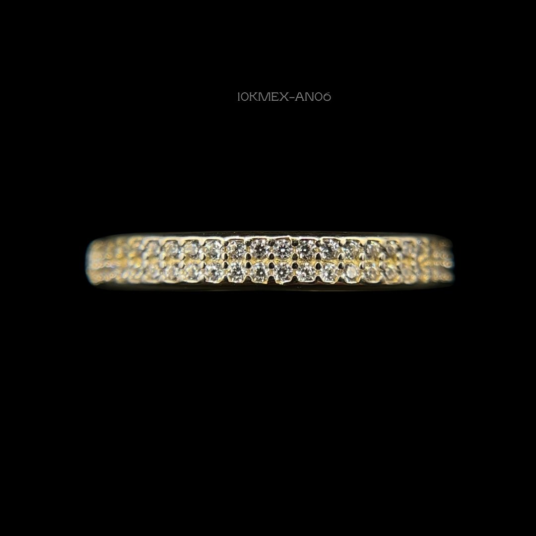 Anillo de 10k Mexicano en oro amarillo con diseño grueso de doble hilera de incrustación de zirconia mini. Medidas: 3mm de ancho en #7. Gramaje: 1.1gr. Precio sujeto a las cotizaciones diarias del oro.
