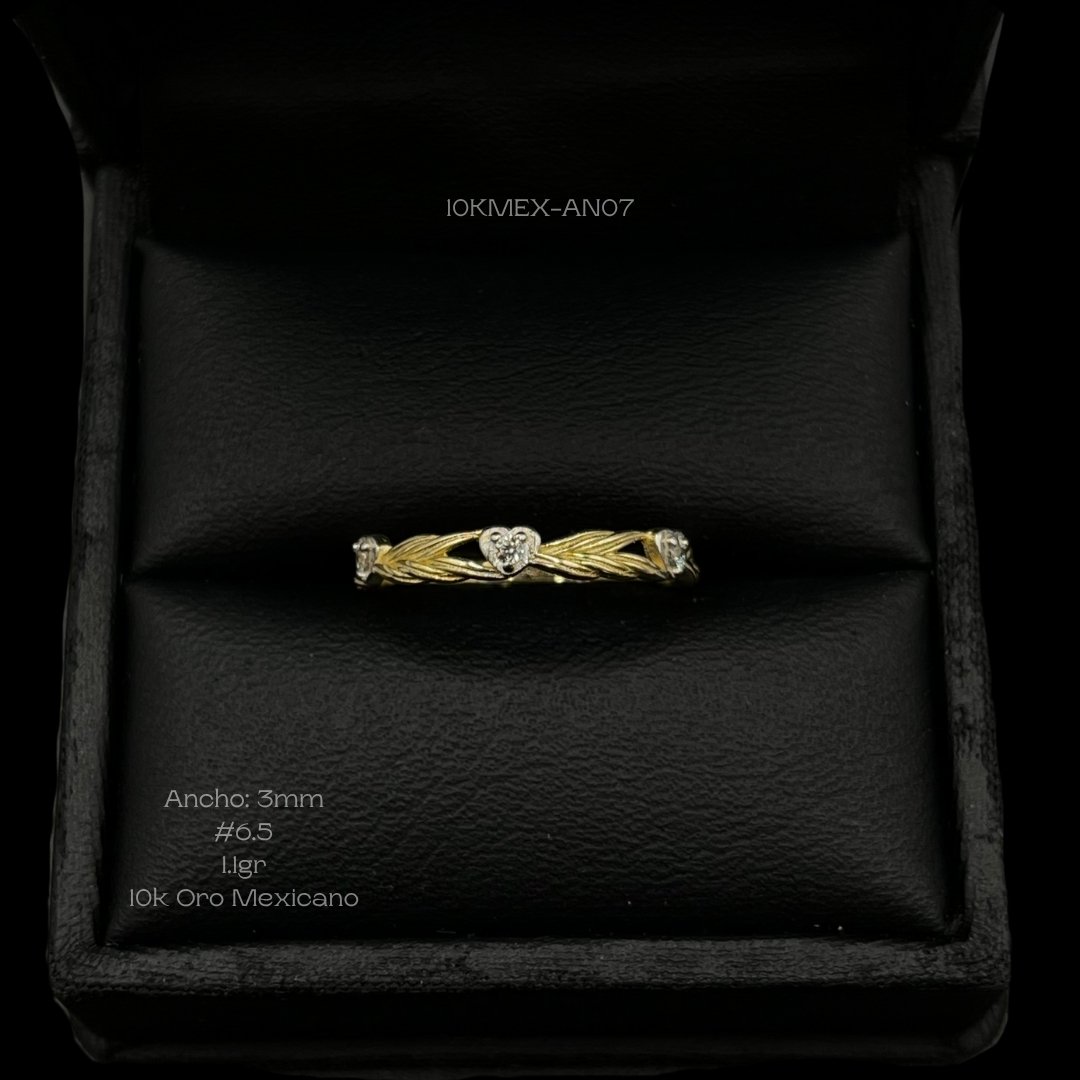 Anillo de 10k Mexicano en oro amarillo con diseño trenzado intercalado con tres corazones en oro blanco con incrustación de zirconia mini al centro con diseño. Medidas: 3mm de ancho en #6.5. Gramaje: 1.1gr. Precio sujeto a las cotizaciones diarias del oro.