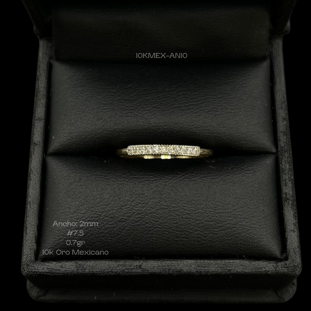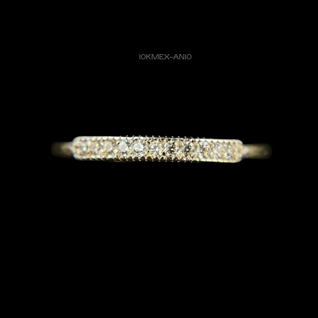 Anillo de 10k Mexicano en oro amarillo con diseño de bloque con incrustación de once zirconias biceladas en oro blanco. Medidas: 2mm de ancho en #7.5. Gramaje: 0.7gr. Precio sujeto a las cotizaciones diarias del oro.