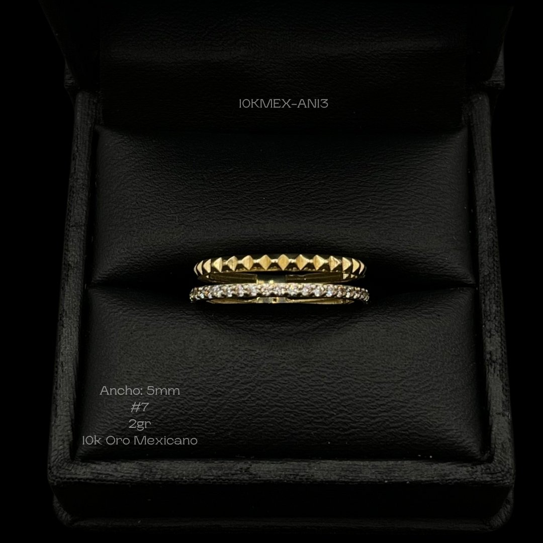 Anillo de 10k Mexicano en oro amarillo con diseño de doble línea, una con incrustación de zirconia y otra simulando estoperoles. Medidas: 5mm de ancho en #7. Gramaje: 2gr. Precio sujeto a las cotizaciones diarias del oro.