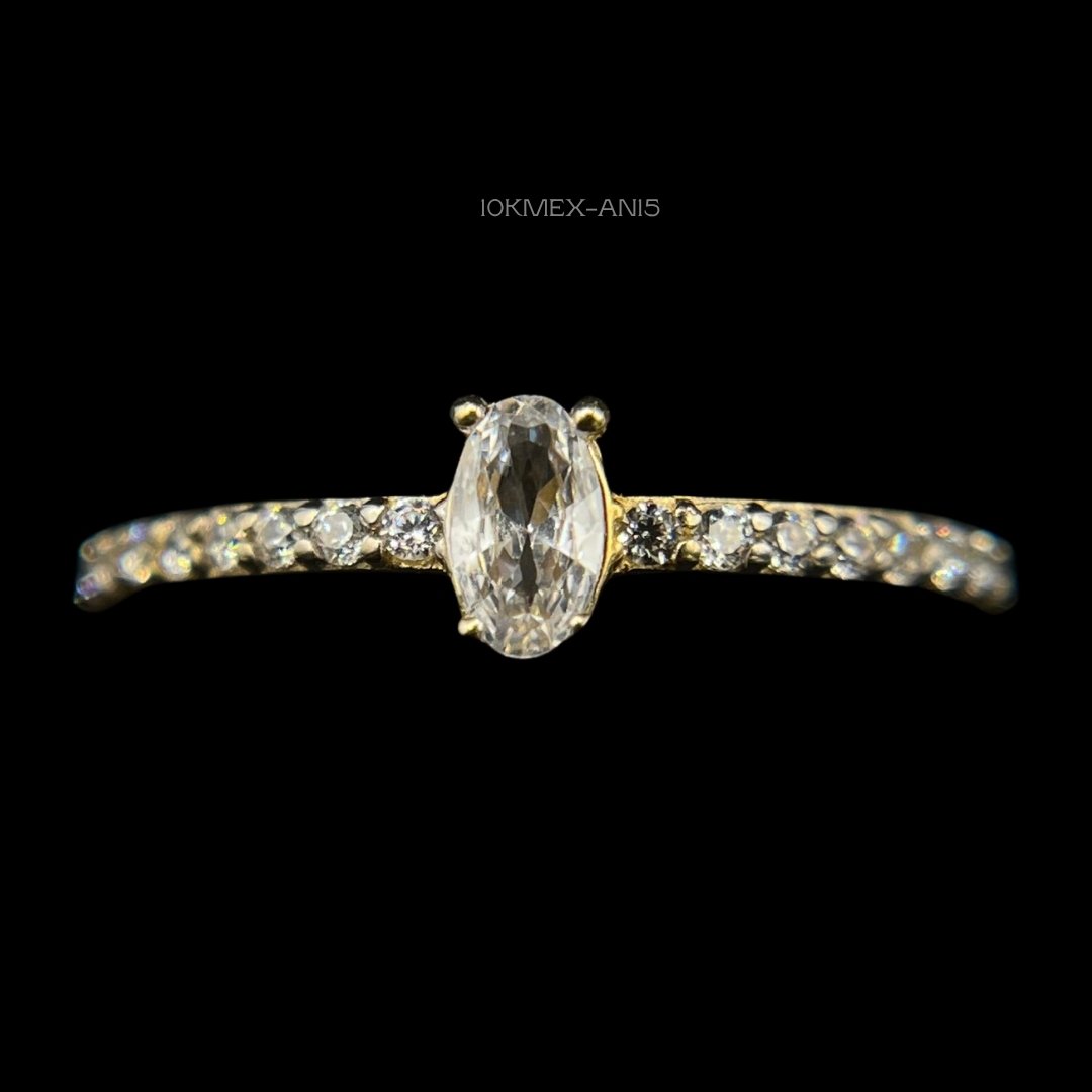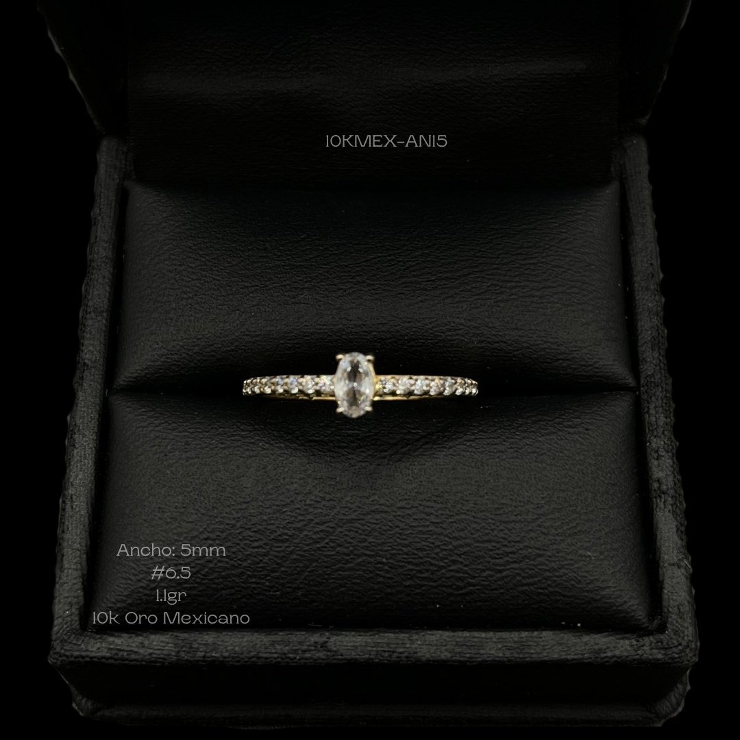 Anillo de 10k Mexicano en oro amarillo con diseño de incrustación de zirconia ovalada central de cuatro uñas con incrustación infinita de zirconia mini a los lados. Medidas: 5mm de ancho en #6.5. Gramaje: 1.2gr. Precio sujeto a las cotizaciones diarias del oro.