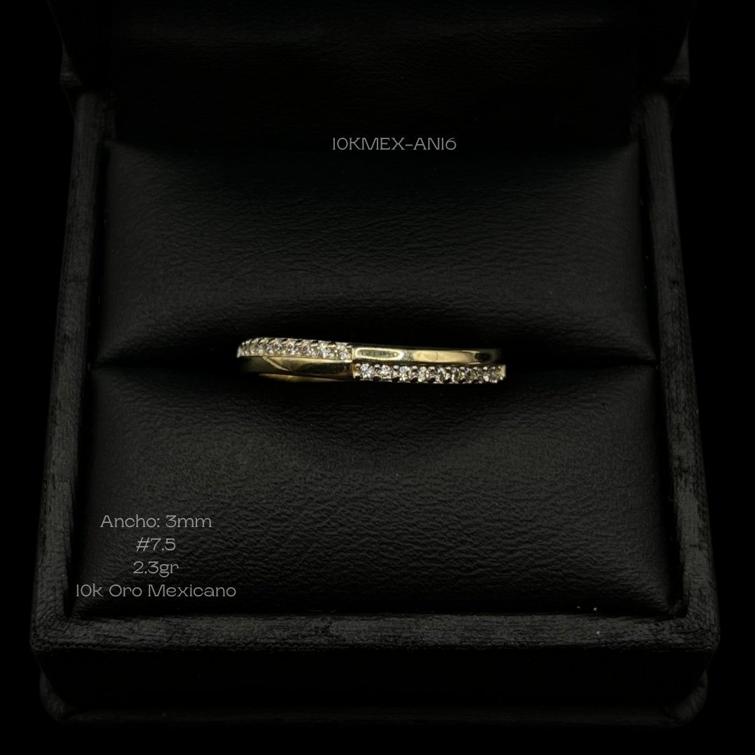 Anillo de 10k Mexicano en oro amarillo con diseño doble hilera, una hilera con incrustación de zirconia encontrada con una hilera lisa. Medidas: 3mm de ancho en #7.5. Gramaje: 2.3gr. Precio sujeto a las cotizaciones diarias del oro.
