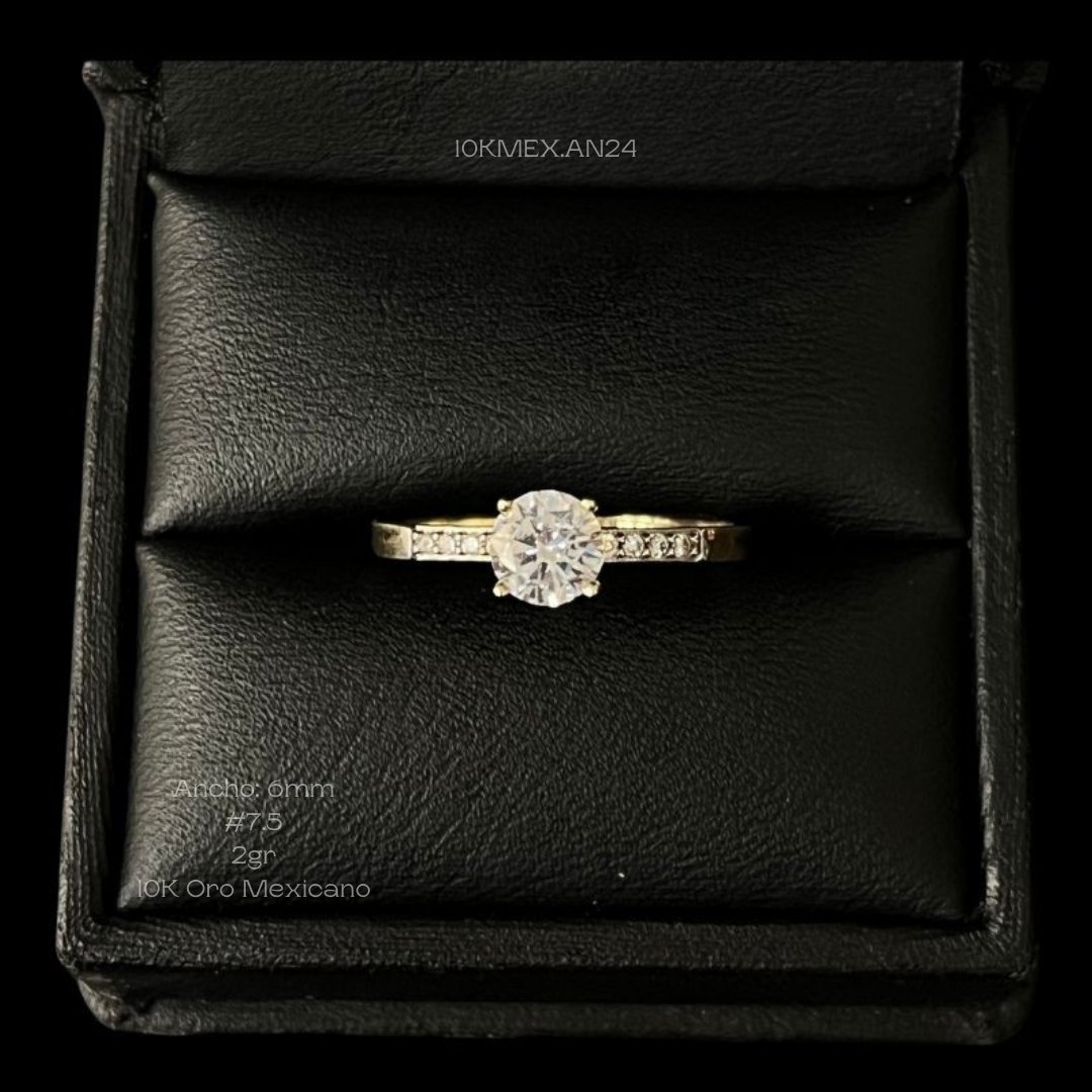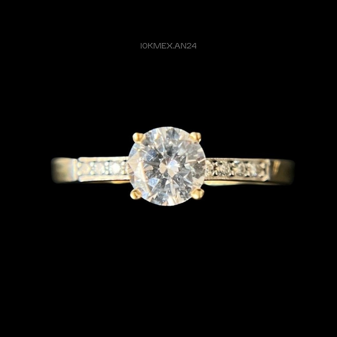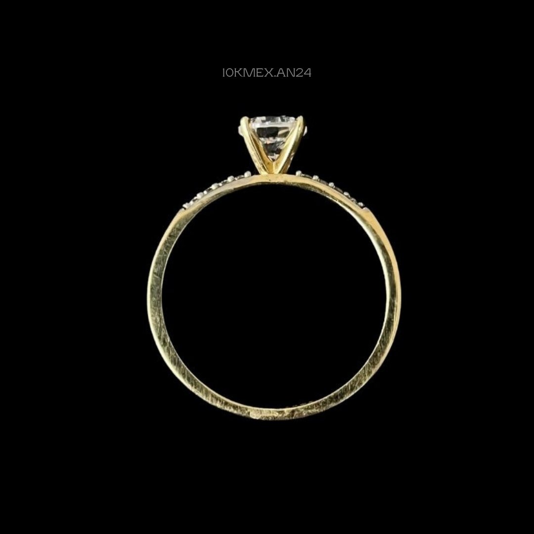Anillo de 10k Mexicano en oro amarillo con diseño liso con zirconia de 6mm, con 4 uñas e incrustación de cuatro zirconias minis de cada lado. Medidas: 6mm de ancho en #7 1/2. Gramaje: 2gr. Precio sujeto a las cotizaciones diarias del oro.
