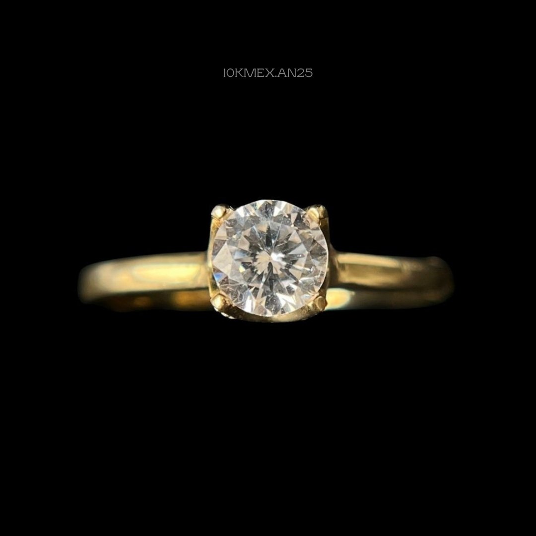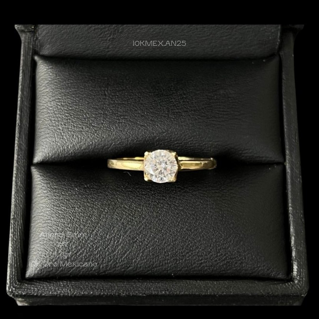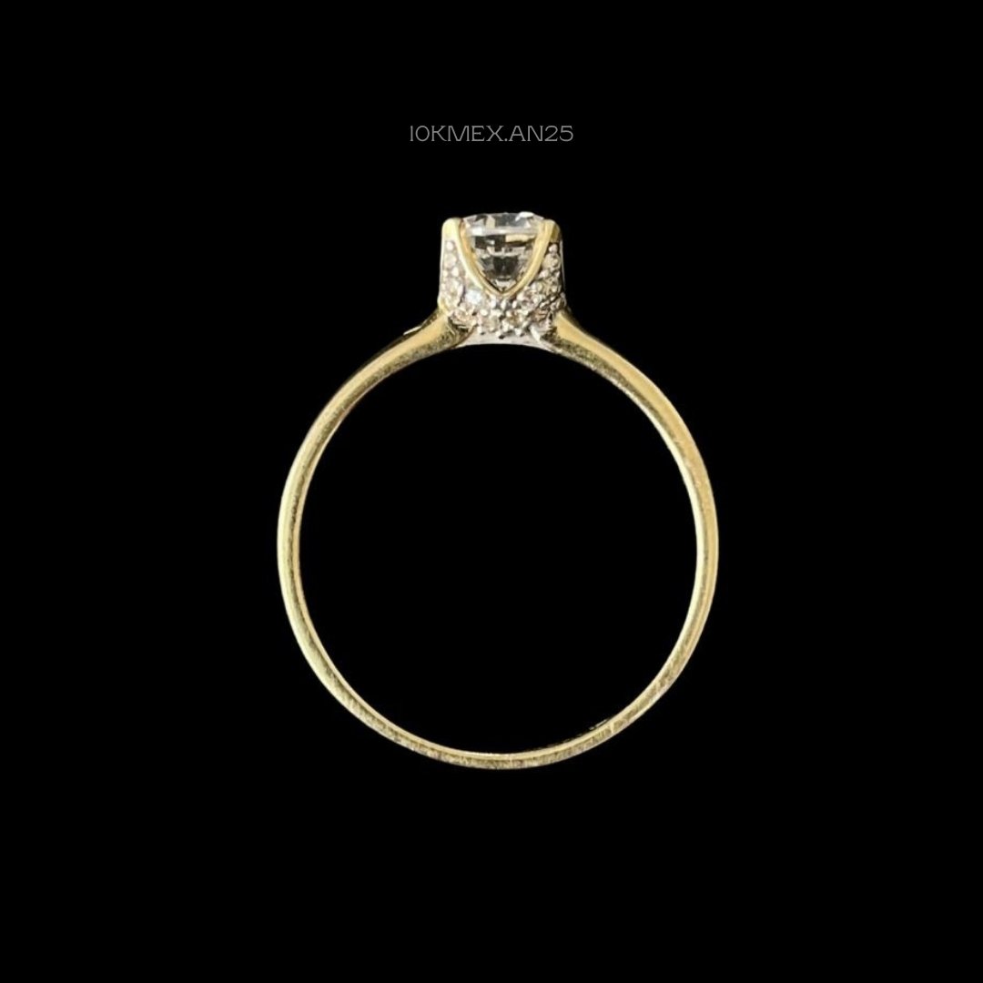 Anillo de 10k Mexicano en oro amarillo con zirconia central de 5mm de diametro, con 4 uñas, con incrustacion de zirconia mini en toda la base simulando una corona. Medidas: 5mm de ancho en #7. Gramaje: 1.7gr. Precio sujeto a las cotizaciones diarias del oro.
