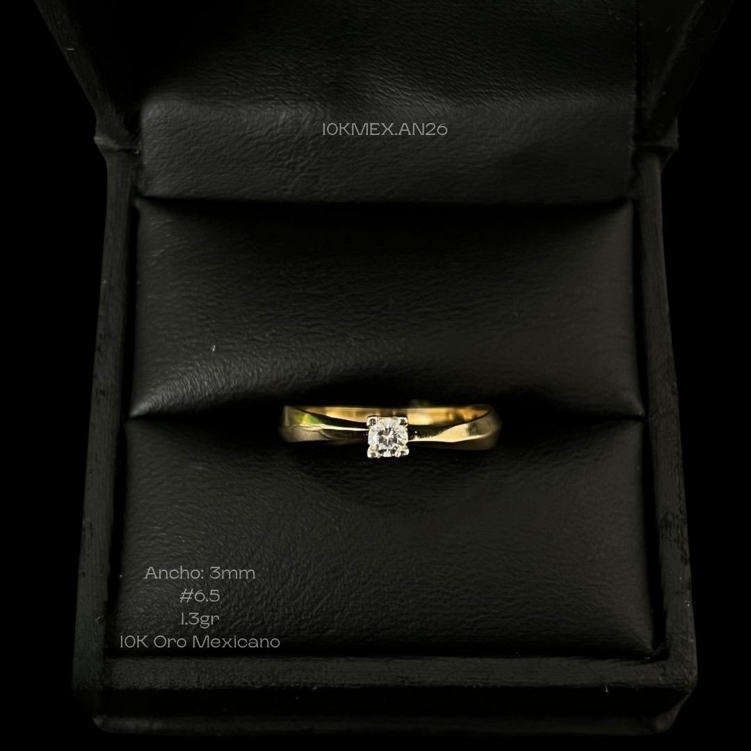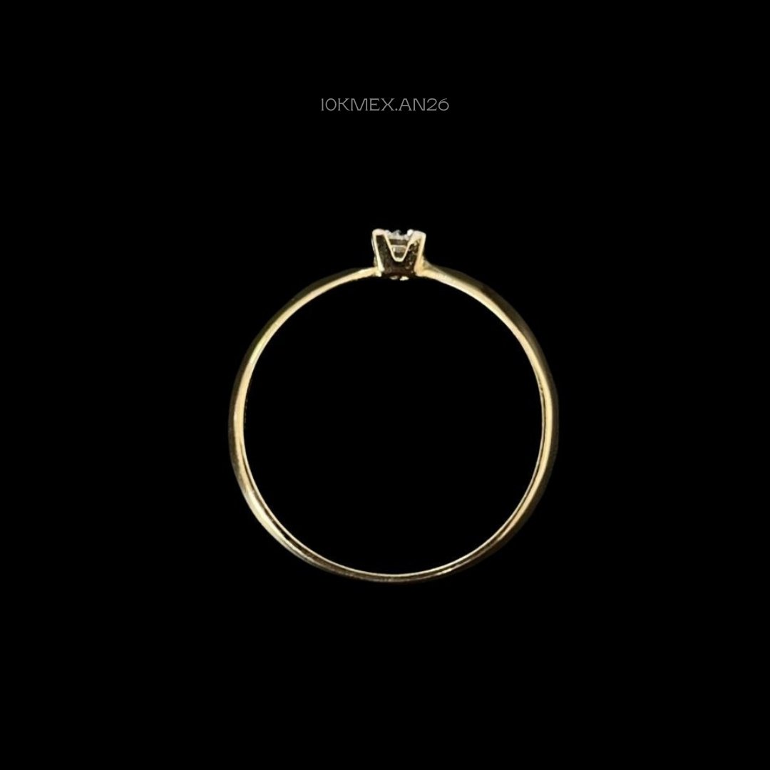 Anillo de 10k Mexicano en oro amarillo con zirconia central de 3mm de diametro, con 4 uñas. Medidas: 3mm de ancho en #6 1/2. Gramaje: 1.3gr. Precio sujeto a las cotizaciones diarias del oro.