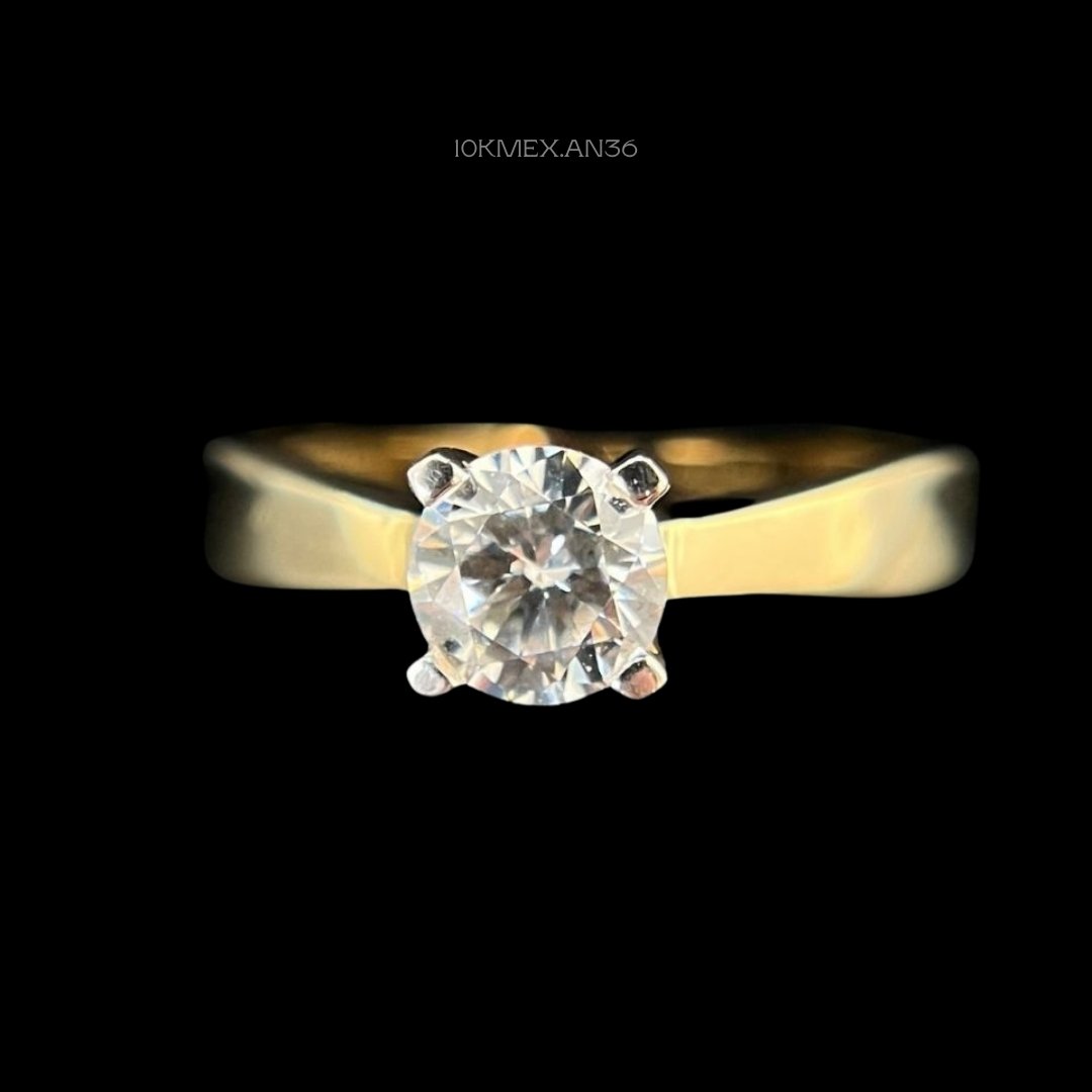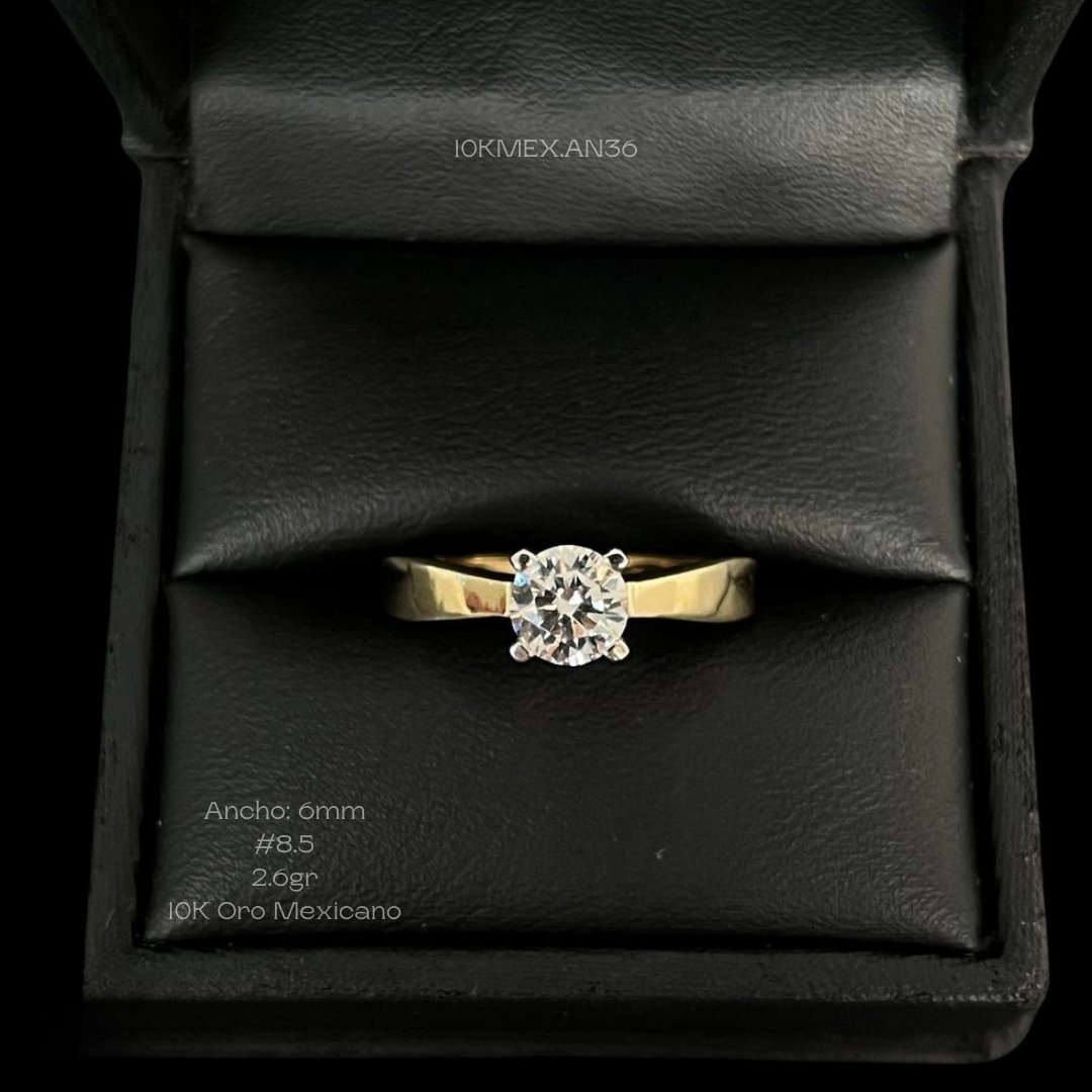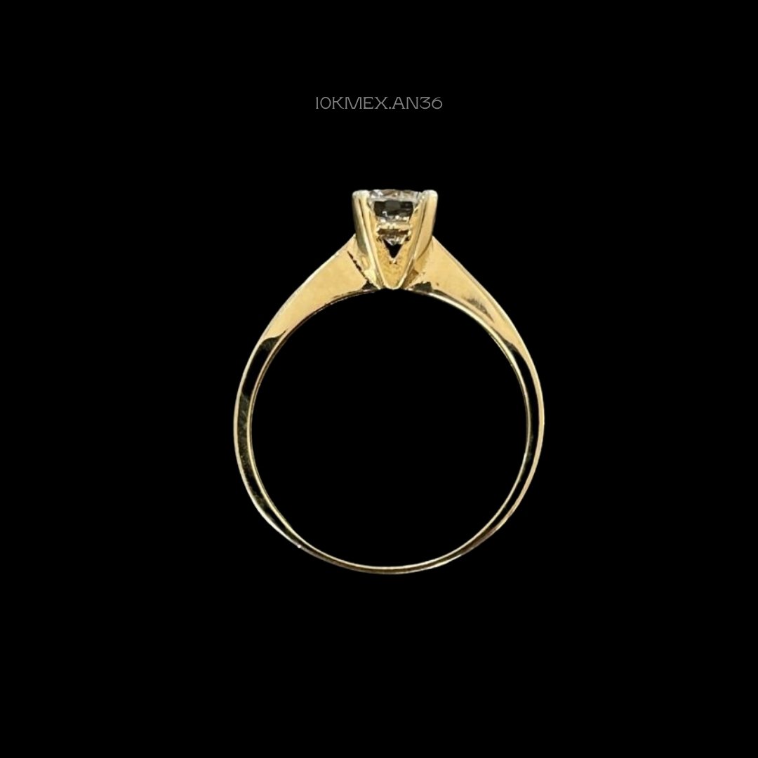 Anillo de 10k Mexicano en oro amarillo con zirconia central de 6mm de diámetro, con 4 uñas. Medidas: 6mm de ancho en #8 1/2. Gramaje: 2.6gr. Precio sujeto a las cotizaciones diarias del oro.