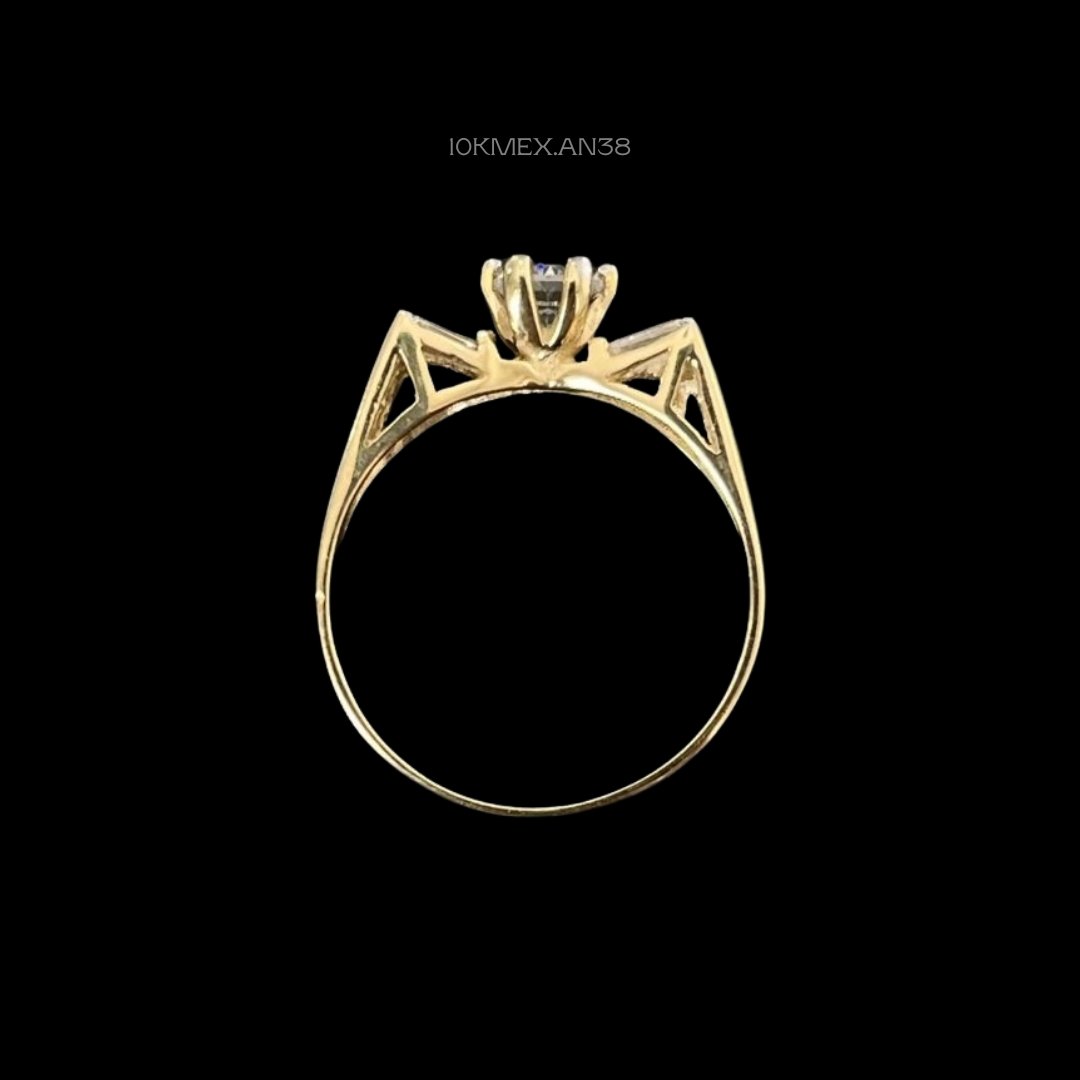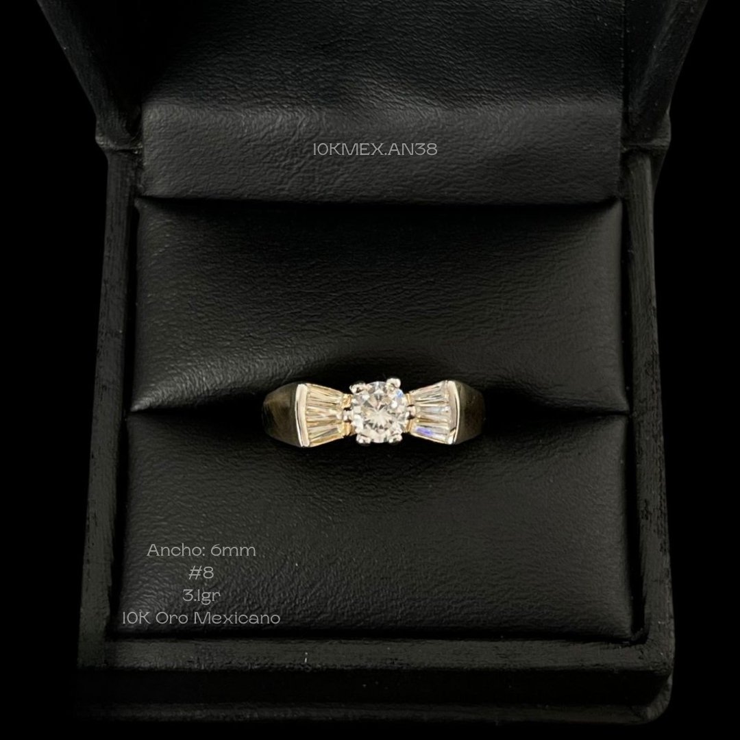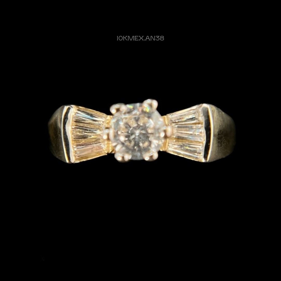 Anillo de 10k Mexicano en oro amarillo con zirconia central de 5mm de diámetro, con 6 uñas, laterales con diseño en forma de abanico y tres zirconias baguette de cada lado.Medidas: 6mm de ancho en #8. Gramaje: 3.1gr. Precio sujeto a las cotizaciones diarias del oro.