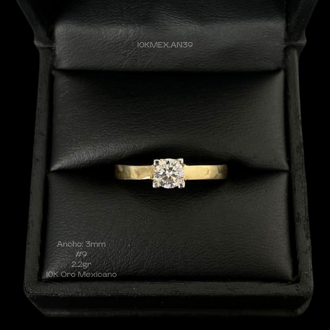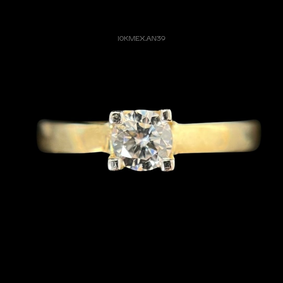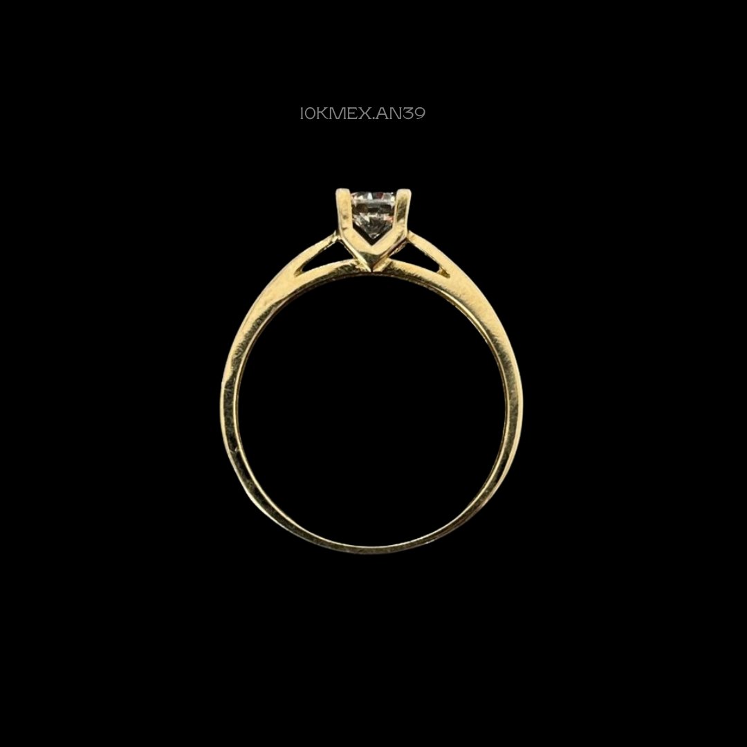 Anillo de 10k Mexicano en oro amarillo con zirconia central de 5mm de diámetro, con 4 uñas. Medidas: 3mm de ancho en #9. Gramaje: 2.2gr. Precio sujeto a las cotizaciones diarias del oro.
