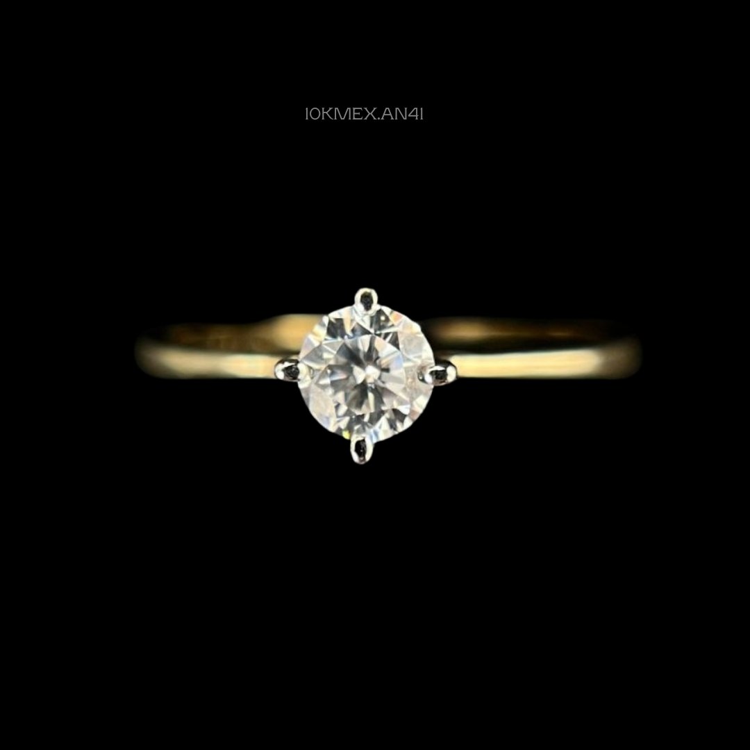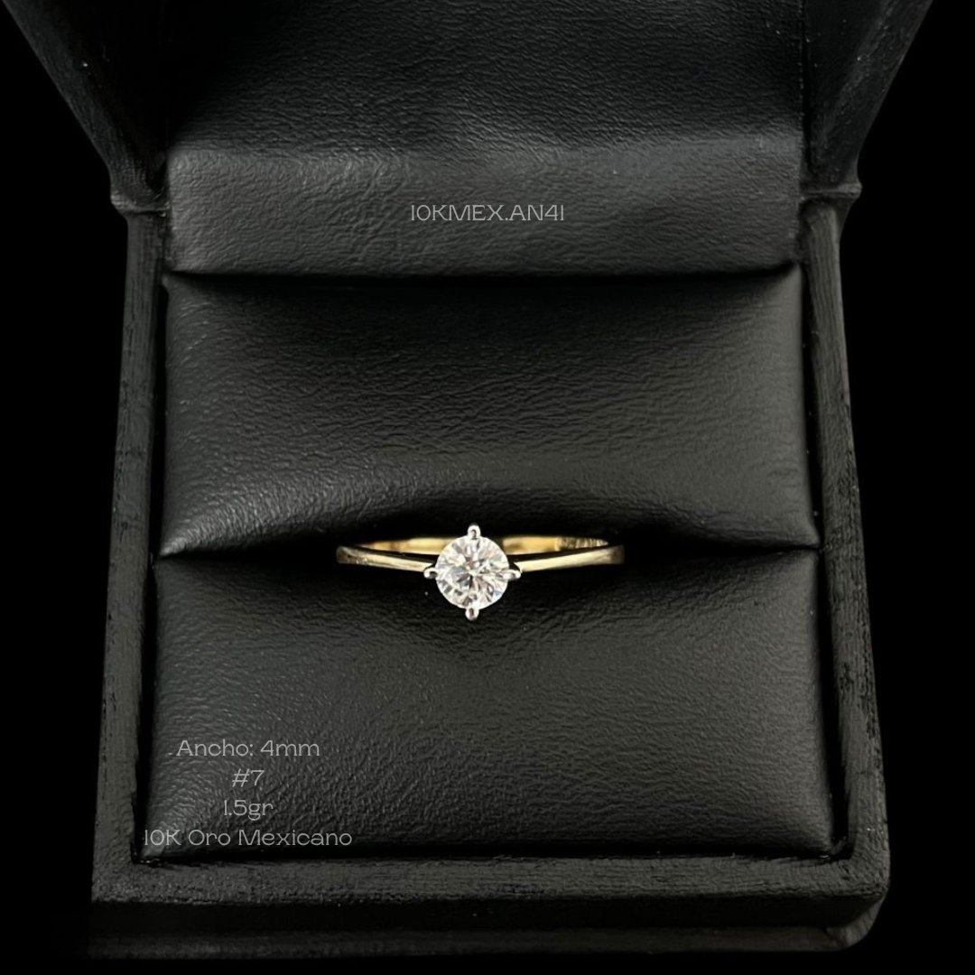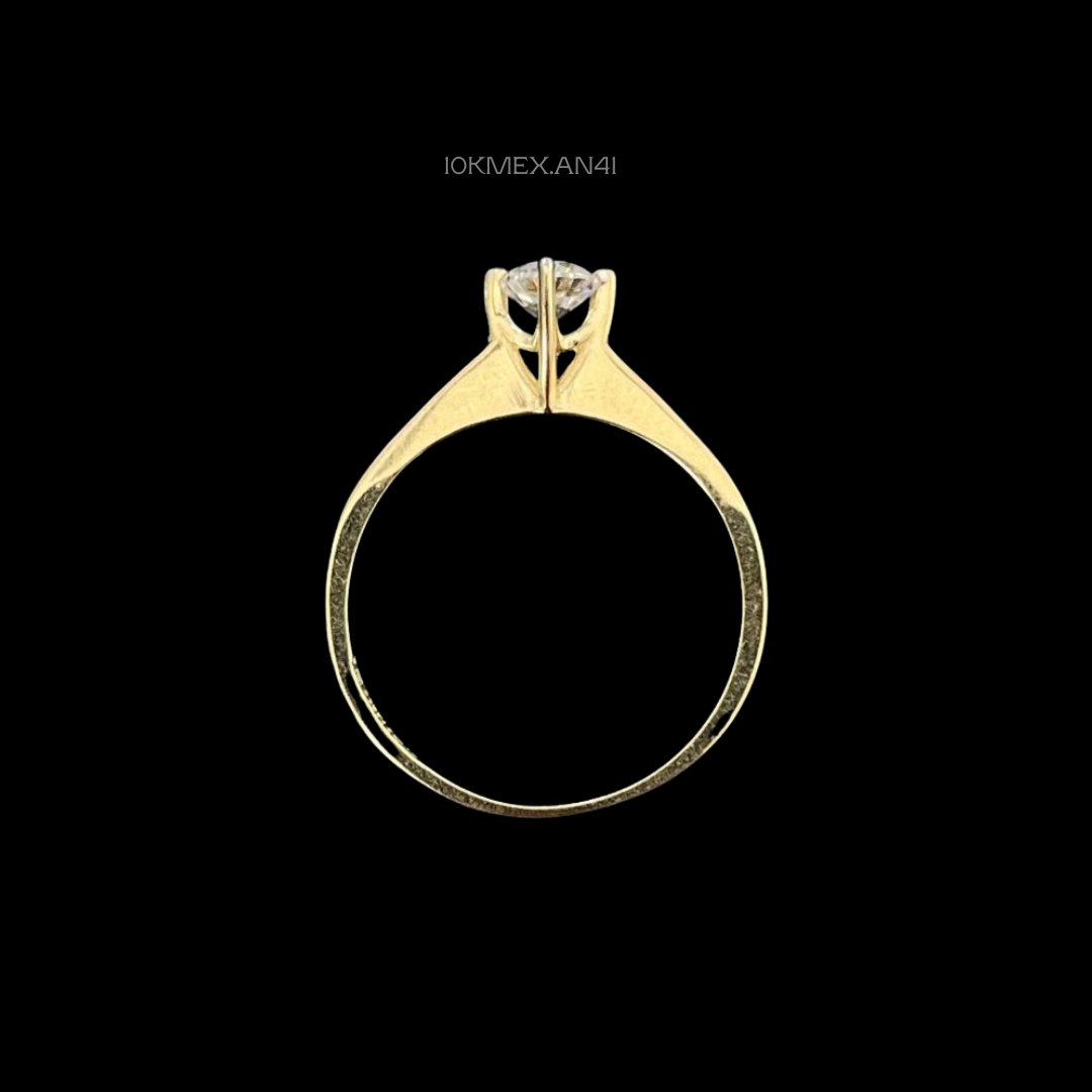 Anillo de 10k Mexicano en oro amarillo con zirconia central de 4mm de diámetro, con 4 uñas. Medidas: 4mm de ancho en #7. Gramaje: 1.5gr. Precio sujeto a las cotizaciones diarias del oro.
