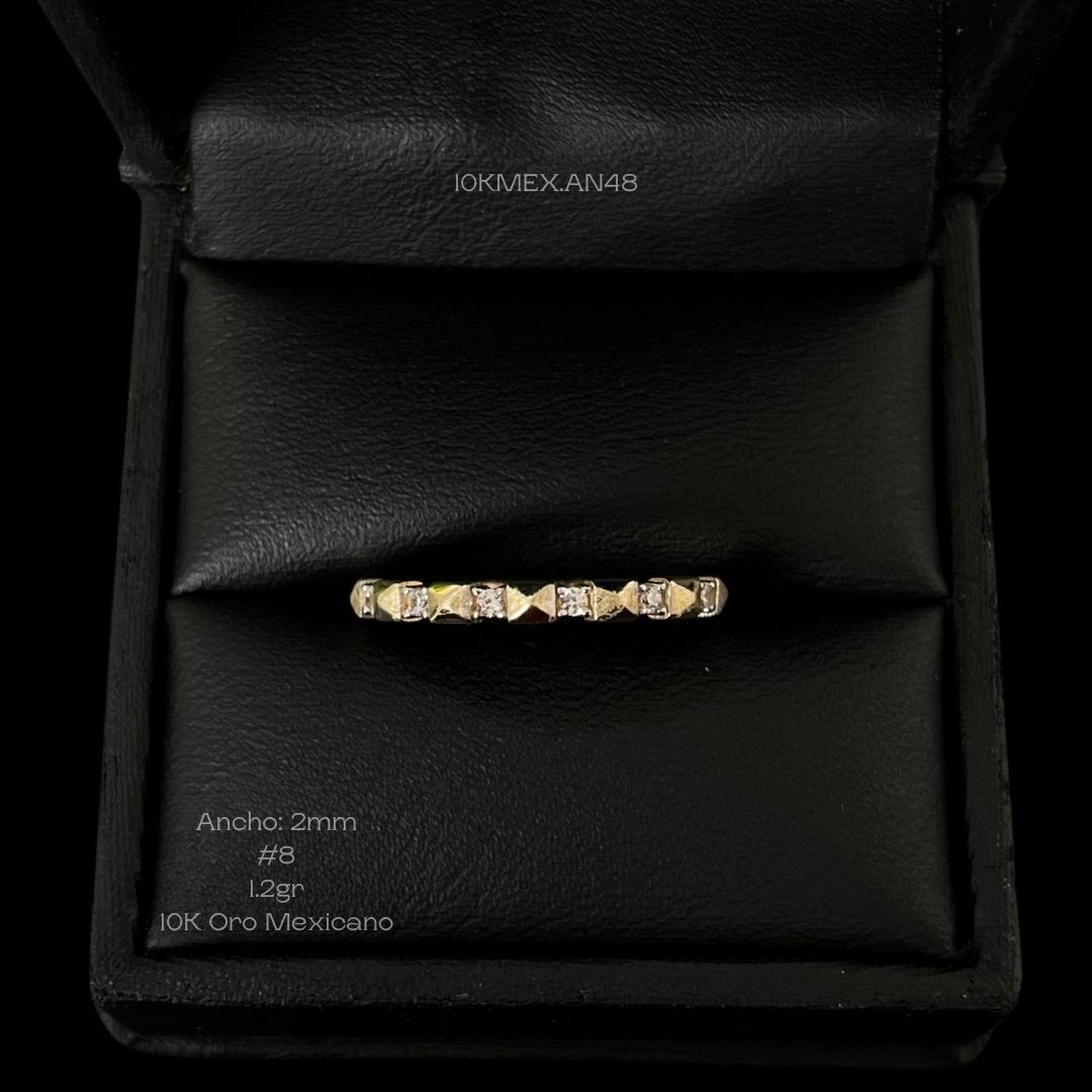 Anillo de 10k Mexicano en oro amarillo con diseño alternado de piramides con incrustación de zirconia mini. Medidas: 2mm de ancho en #8. Gramaje: 1.2gr. Precio sujeto a las cotizaciones diarias del oro.