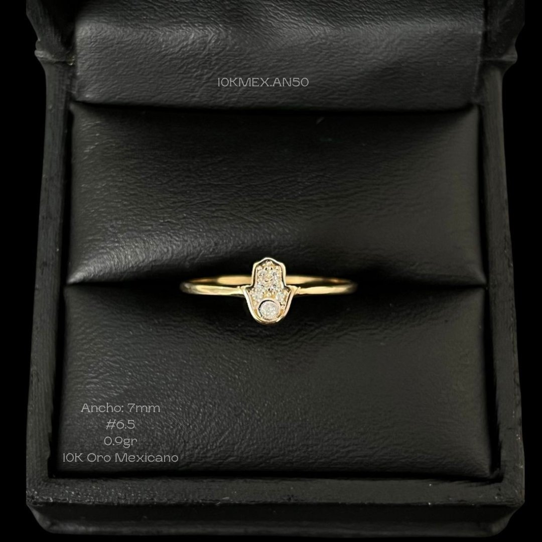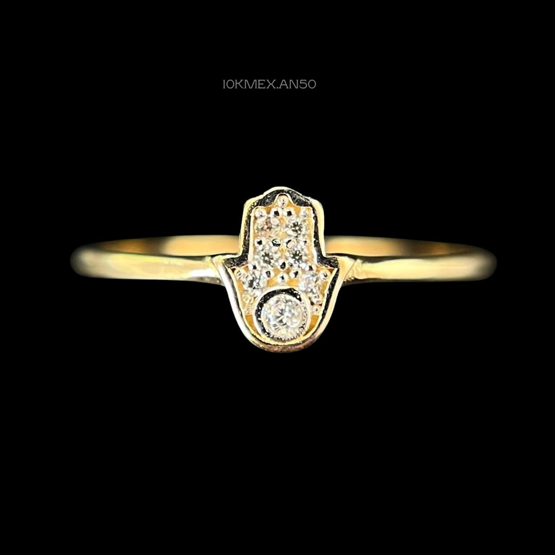 Anillo de 10k Mexicano en oro amarillo con diseño de mano de Fátima con incrustación de zirconia al centro. Medidas: 7mm de ancho en #6.5. Gramaje: 0.9gr. Precio sujeto a las cotizaciones diarias del oro.