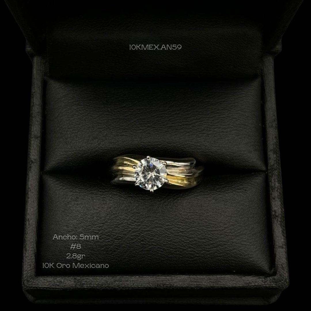 Anillo de 10k Mexicano en oro amarillo con diseño de triple onda al centro en oro amarillo y laterales en oro blanco, con incrustación de zirconia central de 6mm de 6 uñas. Medidas: 5mm de ancho en #8. Gramaje: 2.8gr. Precio sujeto a las cotizaciones diarias del oro.