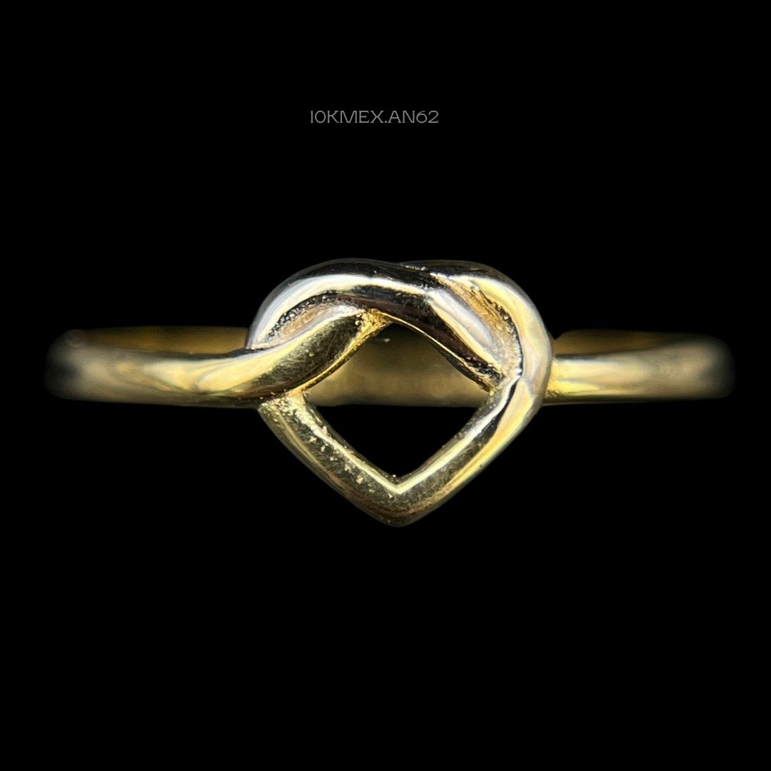 Anillo de 10k Mexicano en oro amarillo con diseño de corazón entrelazado con un detalle en oro blanco. Medidas: 7mm de ancho en #8.5. Gramaje: 0.9gr. Precio sujeto a las cotizaciones diarias del oro.