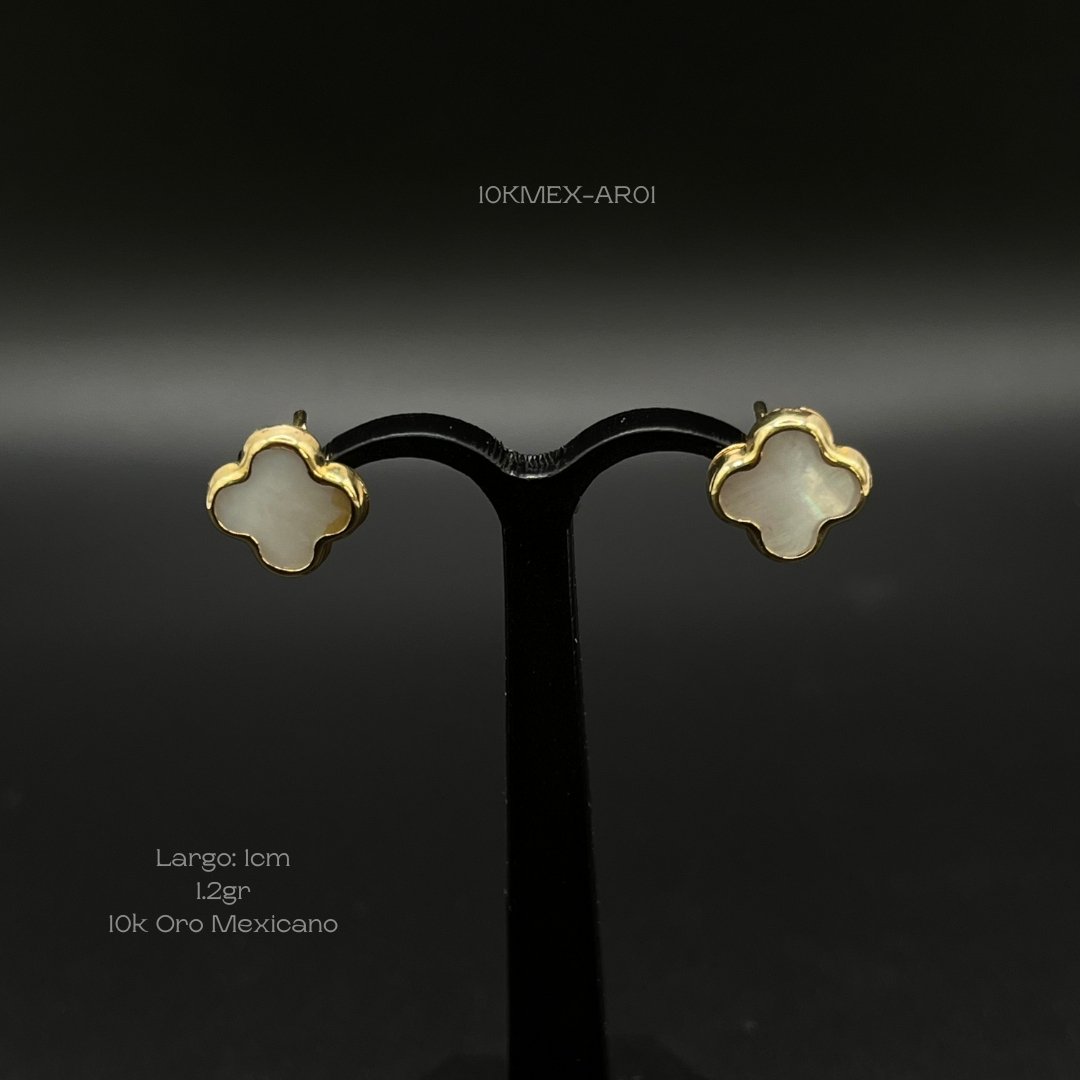 Aretes de 10k Mexicano en oro amarillo con diseño de trébol con madre perla. Medidas: 1cm de ancho. Gramaje: 1.2gr. Precio sujeto a las cotizaciones diarias del oro.