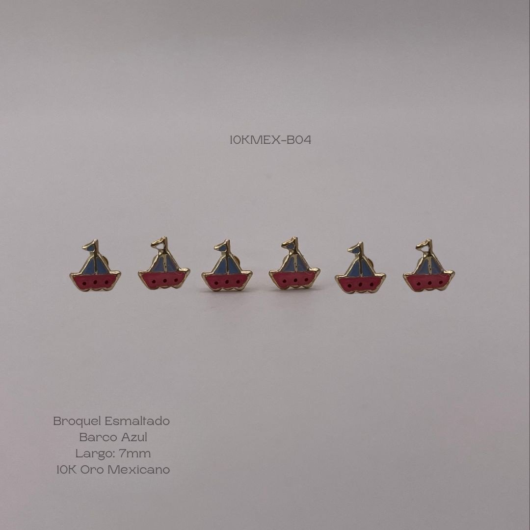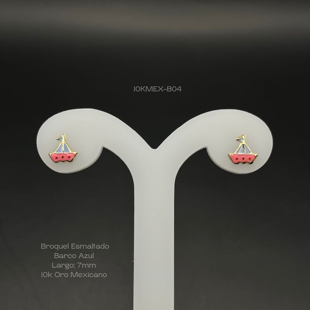 Broquel de 10k Mexicano con diseño barquito con esmaltado de color azul y rosa de 7mm. Precio sujeto a las cotizaciones diarias del oro.