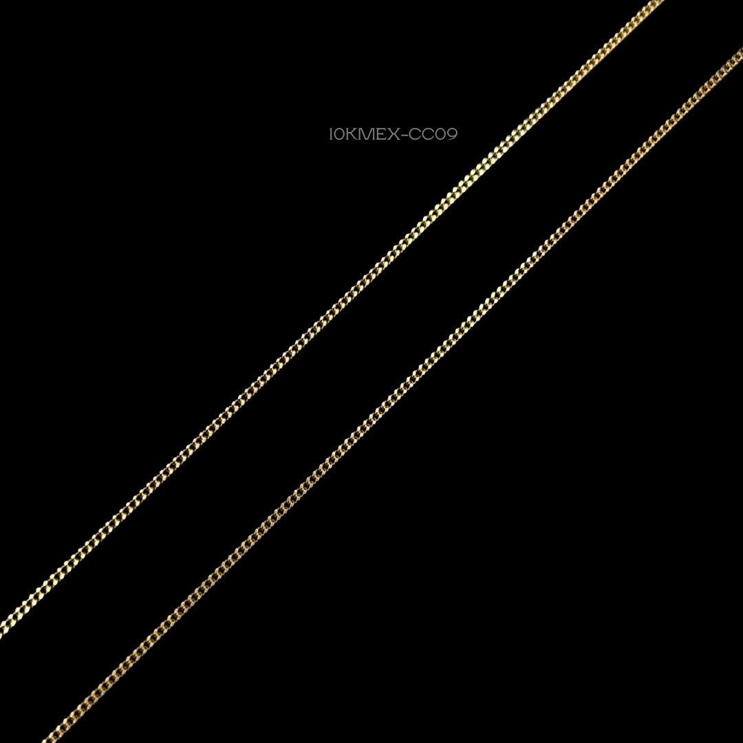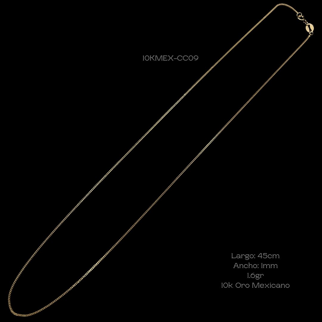 Cadena de 10k Mexicano de tejido barbado. Medidas: 45cm de largo y 1mm de ancho. Gramaje: 1.6gr. Precio sujeto a las cotizaciones diarias del oro.