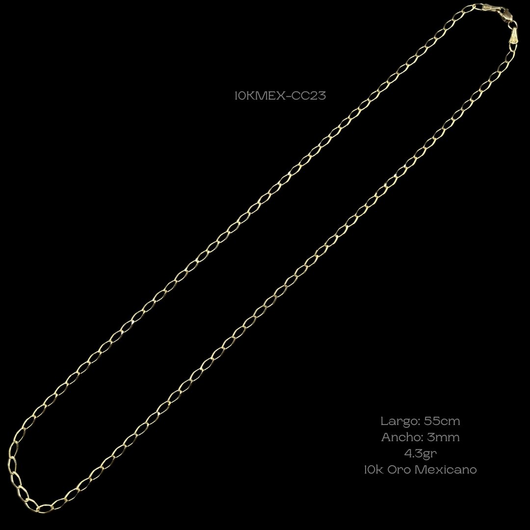 Cadena de 10k Mexicano de tejido inglés. Medidas: 55cm de largo y 3mm de ancho. Gramaje: 4.3gr. Precio sujeto a las cotizaciones diarias del oro.