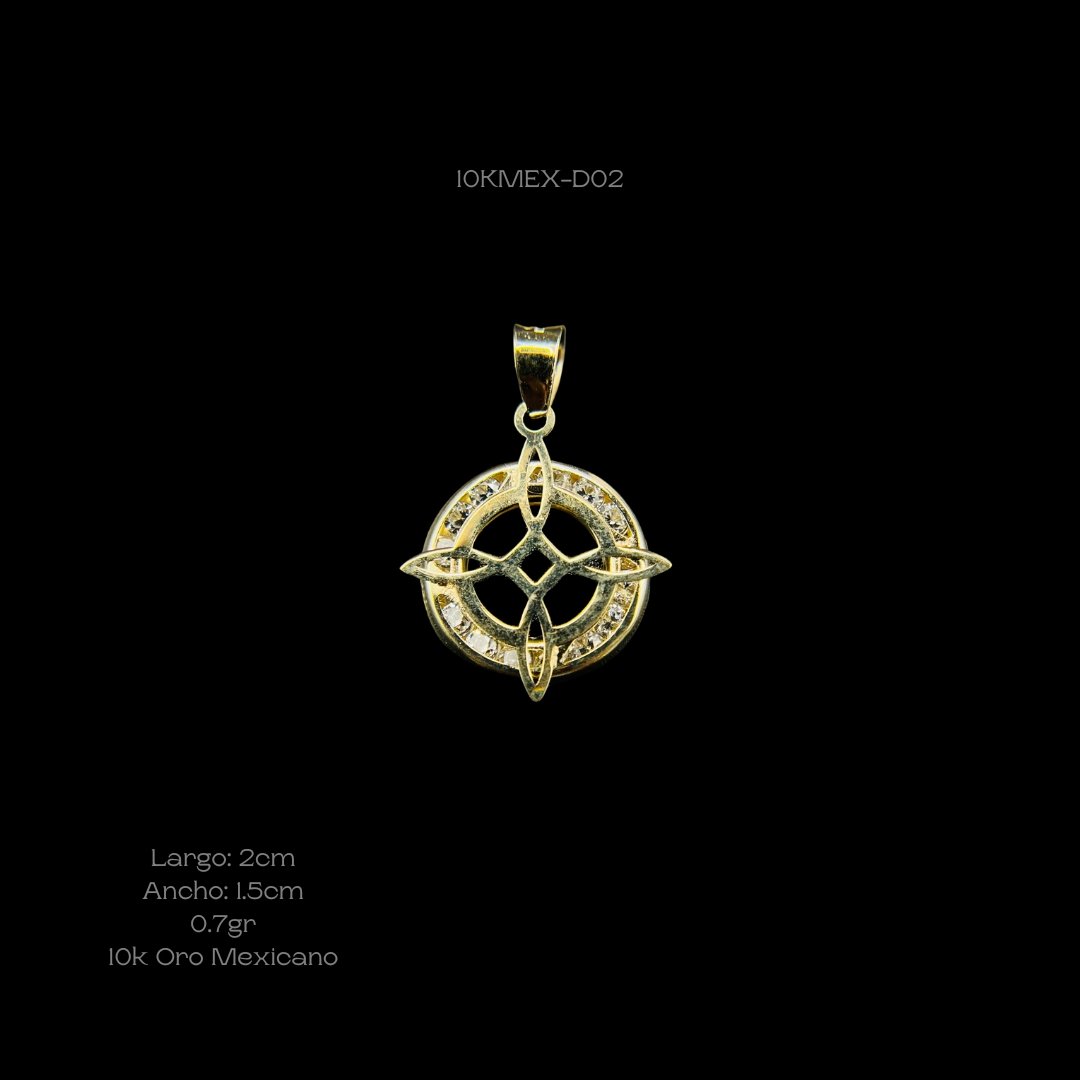 Dije de 10k Mexicano con diseño de nudo de bruja al centro con incrustación de zirconia alrededor. Medidas: 2cm de largo y 1.5cm de ancho. Gramaje: 0.7gr. Precio sujeto a las cotizaciones diarias del oro.