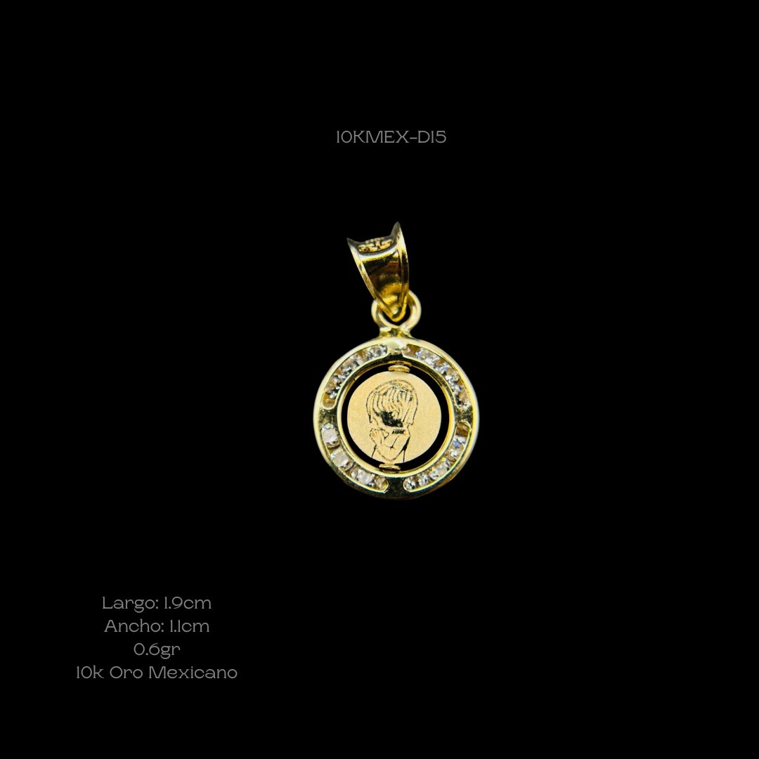 Dije de 10k Mexicano con diseño de medalla giratoria de doble diseño, con diseño de un niño orando y el revés de comunión, con el contorno con incrustación de zirconia. Medidas: 1.9cm de largo y 1.1cm de ancho. Gramaje: 0.6gr. Precio sujeto a las cotizaciones diarias del oro.
