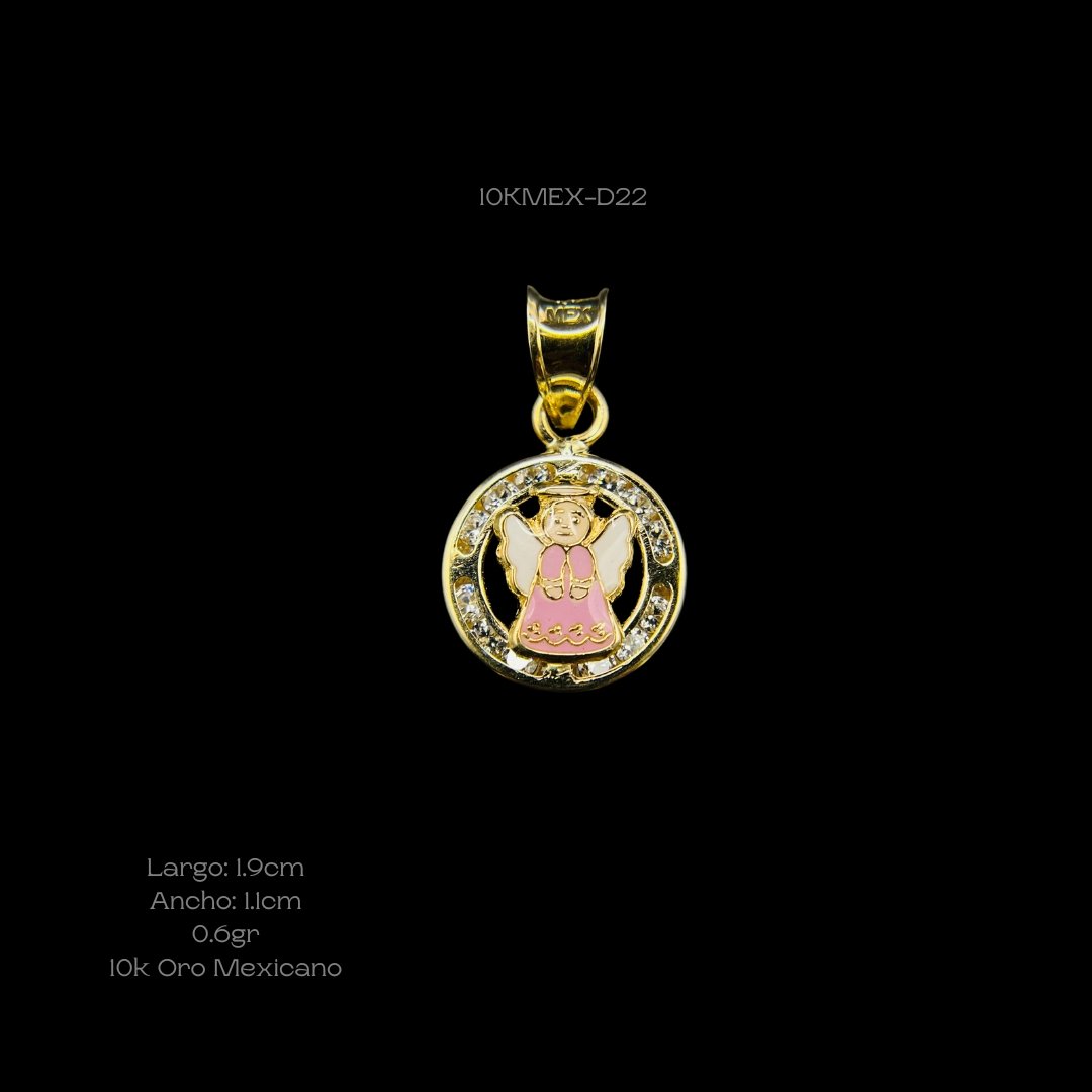 Dije de 10k Mexicano medalla con diseño central de esmaltado de ángel con incrustación de zirconia en el contorno. Medidas: 1.9cm de largo y 1.1cm de ancho. Gramaje: 0.6gr. Precio sujeto a las cotizaciones diarias del oro.