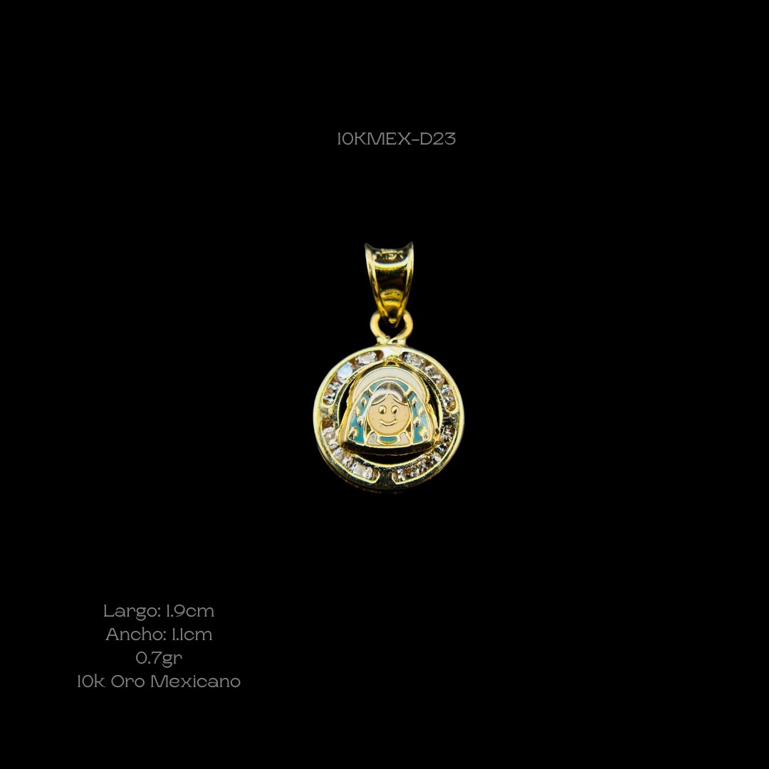Dije de 10k Mexicano medalla con diseño central esmaltado de la Virgen de Guadalupe con incrustación de zirconia en el contorno. Medidas: 1.9cm de largo y 1.1cm de ancho. Gramaje: 0.7gr. Precio sujeto a las cotizaciones diarias del oro.