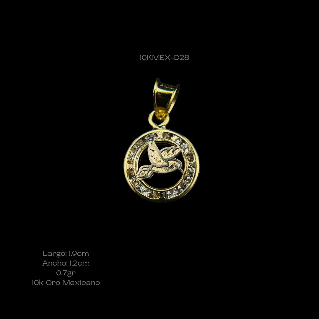 Dije de 10k Mexicano con diseño de medalla de colibrí con incrustación de zirconia en el contorno. Medidas: 1.9cm de largo y 1.2cm de ancho. Gramaje: 0.7gr. Precio sujeto a las cotizaciones diarias del oro.