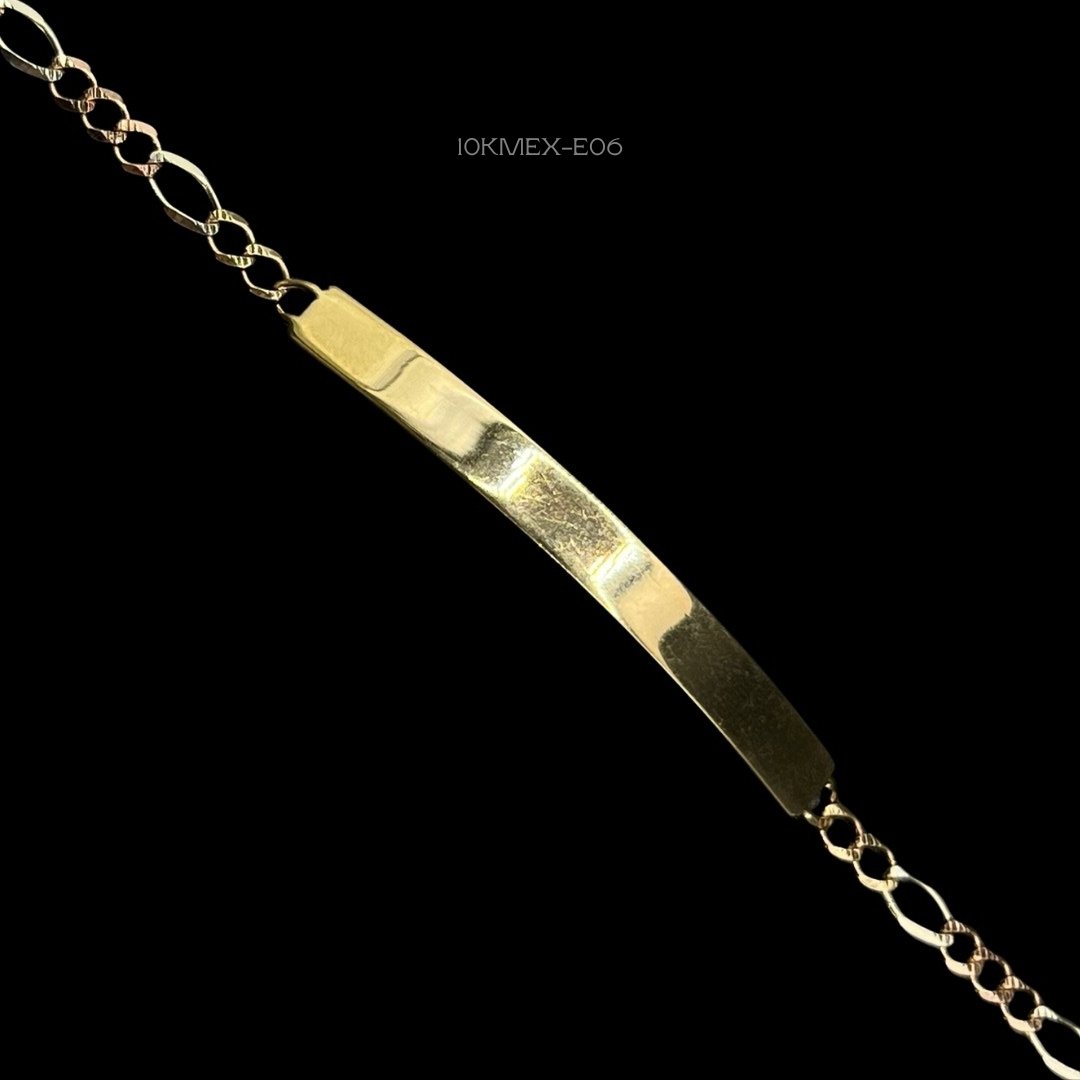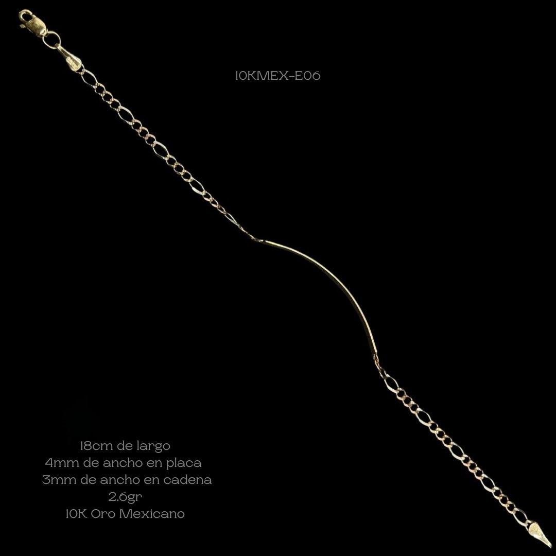 Esclava de 10k oro Mexicano con tejido cartier el oro florentino con placa lisa. Medidas: 18cm de largo, 4mm de ancho en placa y 3mm de ancho en cadena. Gramaje: 2.6gr. Precio sujeto a las cotizaciones diarias del oro.