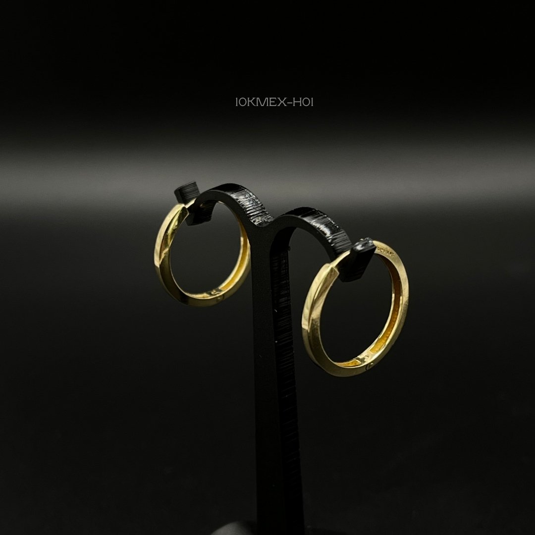 Hoops de 10k Mexicano en oro amarillo con diseño grueso liso. Medidas: 1.7cm de largo y 2mm de ancho. Gramaje: 2.3gr. Precio sujeto a las cotizaciones diarias del oro.