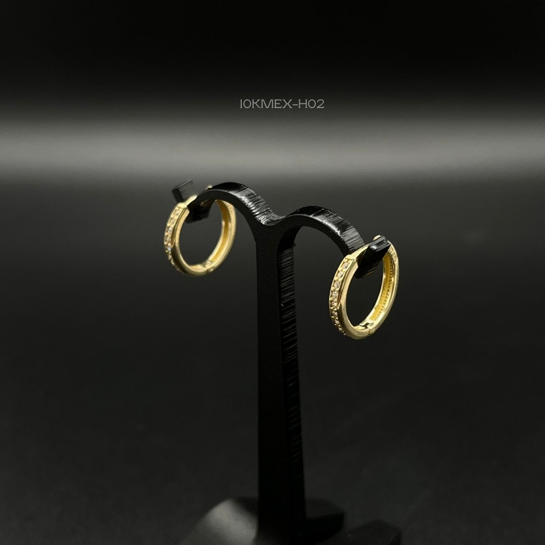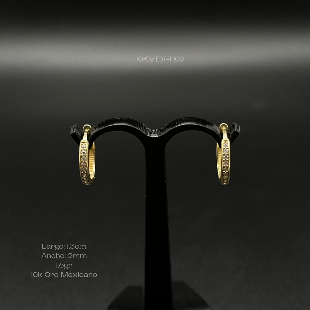 Hoops de 10k Mexicano en oro amarillo con diseño de incrustación de zirconia mini. Medidas: 1.3cm de largo y 2mm de ancho. Gramaje: 1.6gr. Precio sujeto a las cotizaciones diarias del oro.